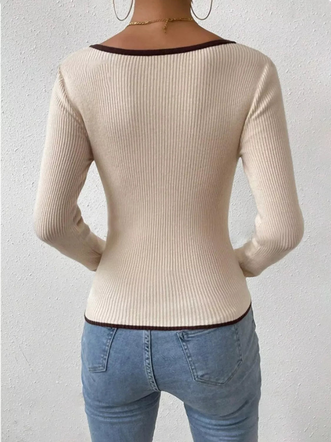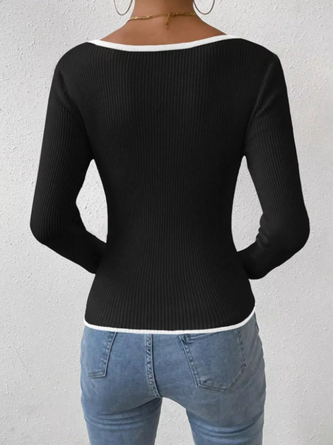 This top features a refined vertical ribbed texture and a beautifully fitted silhouette. The chic, scooped V-neckline and sleeve cuffs are finished with a contrast trim, providing a sophisticated, layered look without the bulk. Made from a luxurious blend of viscose and polyamide, this top is soft, slightly stretchy, and perfect for layering under blazers or wearing solo with high-waist denim.