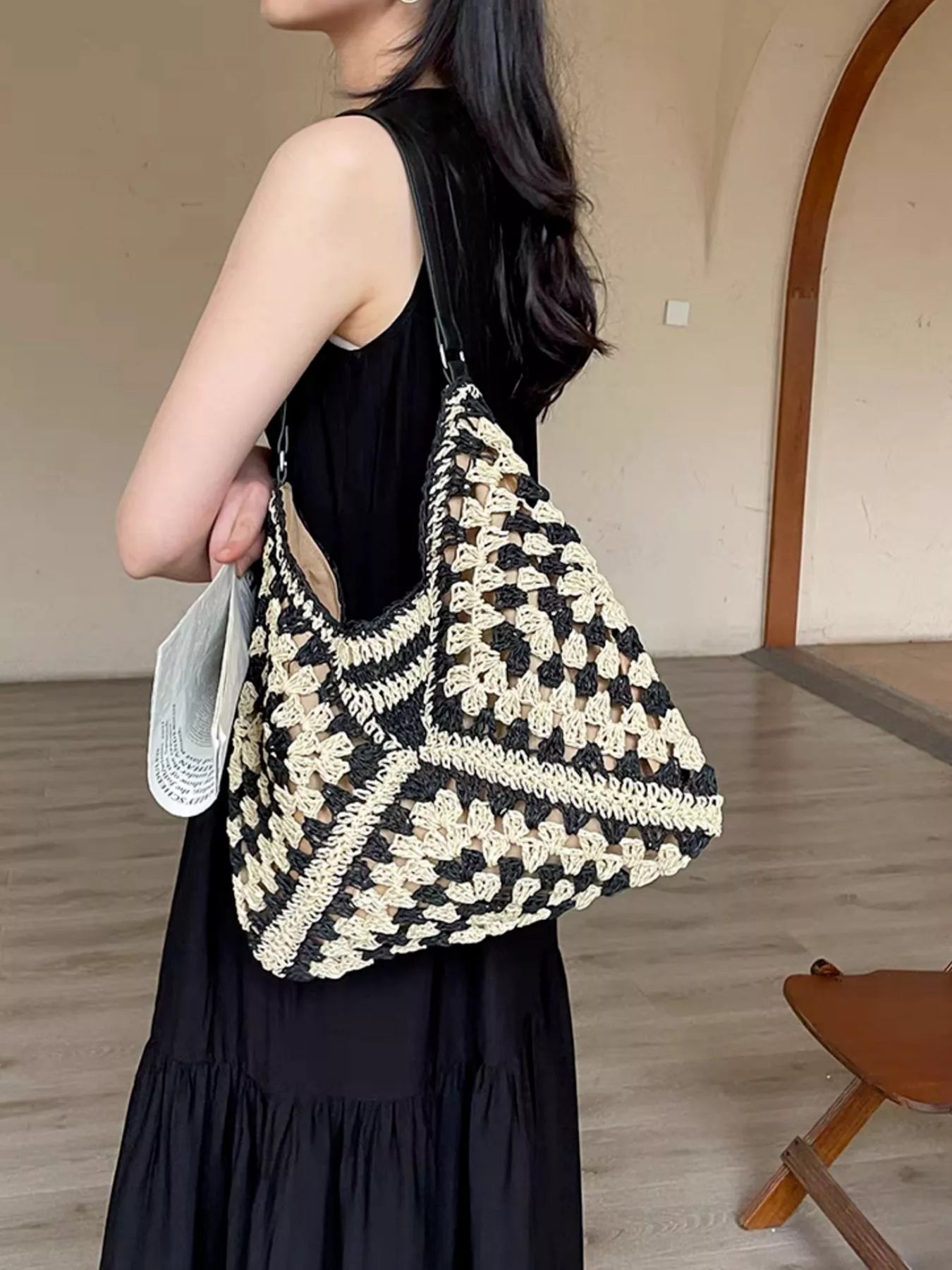 Add a touch of effortless charm to your everyday look with this beautifully woven two-tone crochet bag. Its soft structure, roomy interior, and casual slouchy shape make it the perfect go-to for market days, weekend getaways, or beach strolls. The neutral black-and-cream pattern pairs easily with any outfit — from flowy dresses to denim days.