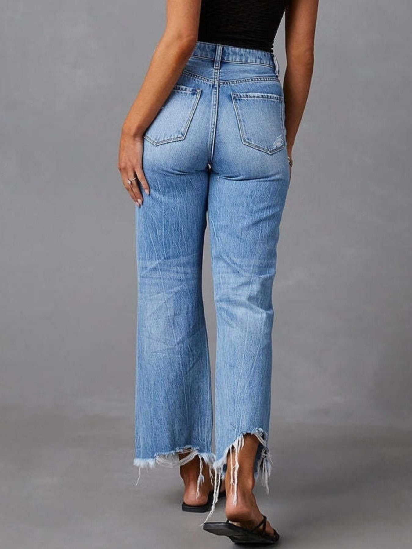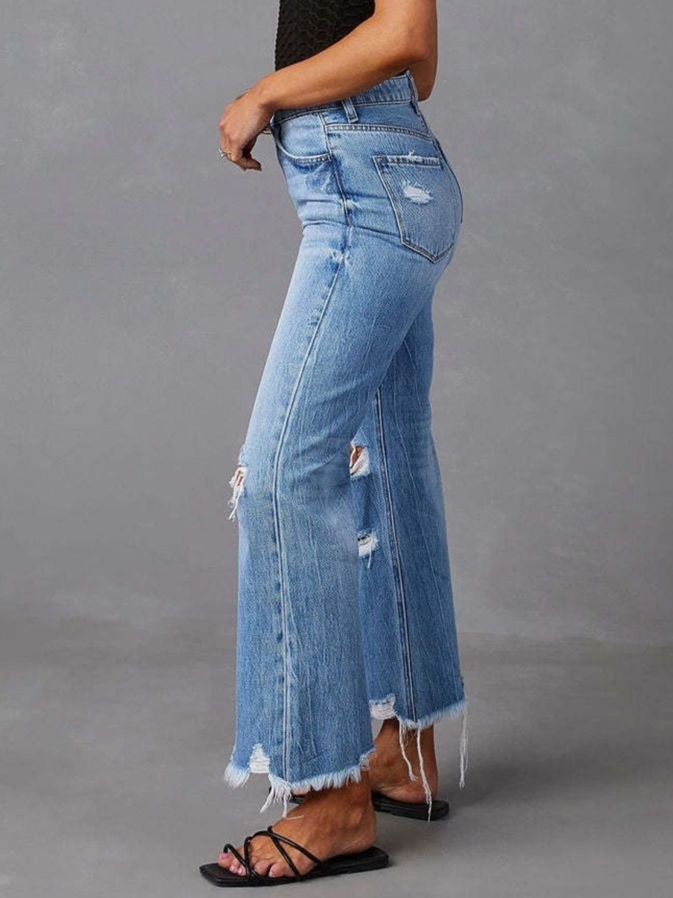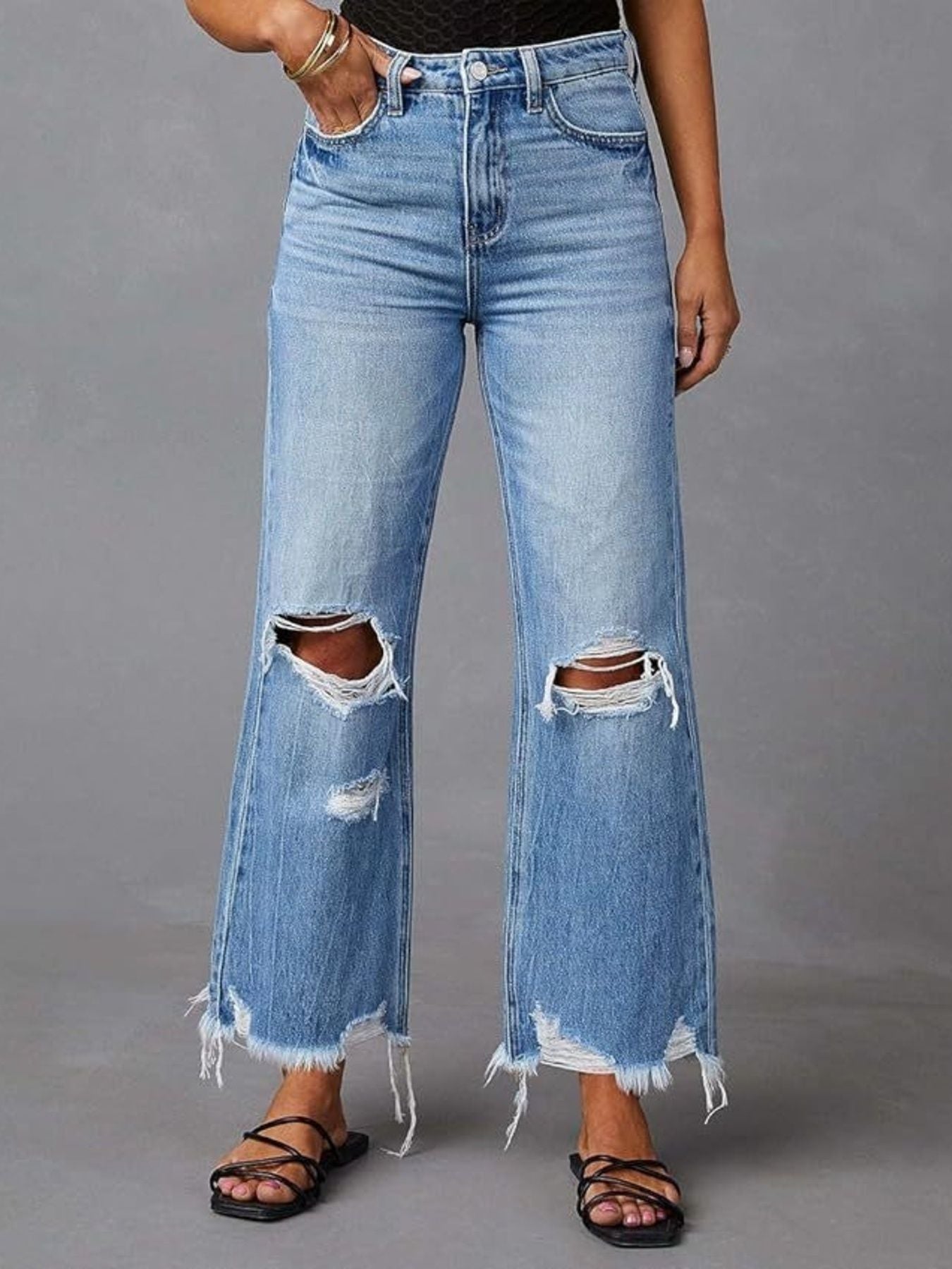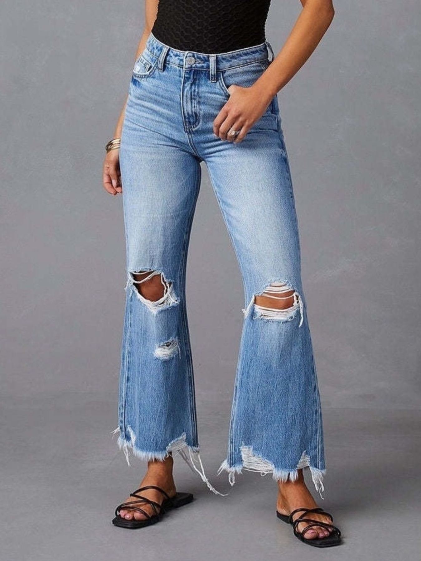 Capture a look that balances statuesque street-style grit with a curated, high-end boutique finish. The Retro Revival Flare Jeans feature a classic light-wash denim in muted blue tones, offering a "next level" aesthetic that effortlessly upgrades your daily rotation. This contemporary essential is defined by its architectural flare silhouette and intentional distressed detailing at the knees, providing a polished metropolitan vibe with an unpolished edge. Crafted from a premium blend of 85% cotton and 15% polyester, these jeans deliver a structured, no-stretch profile for an authentic, vintage-inspired handle.