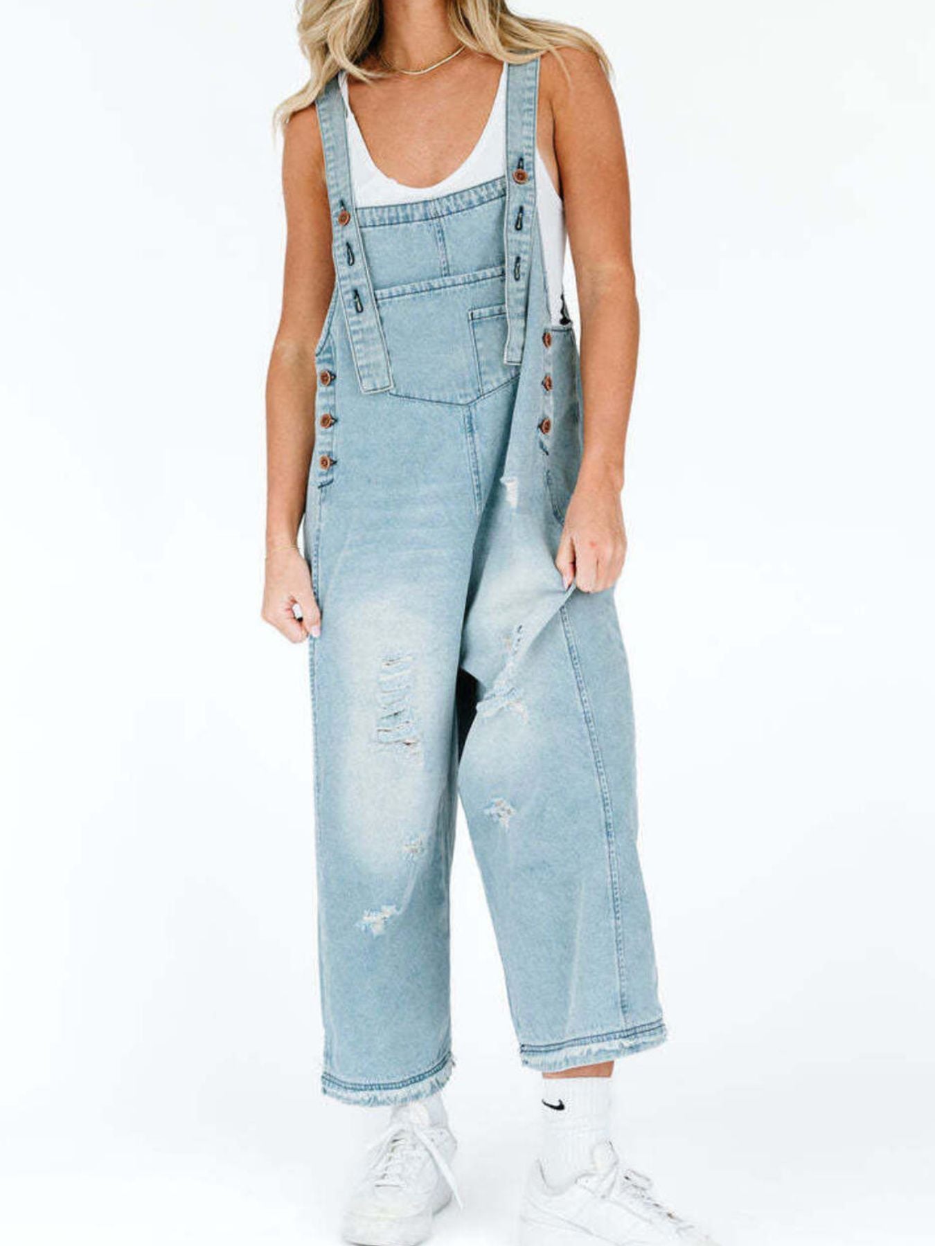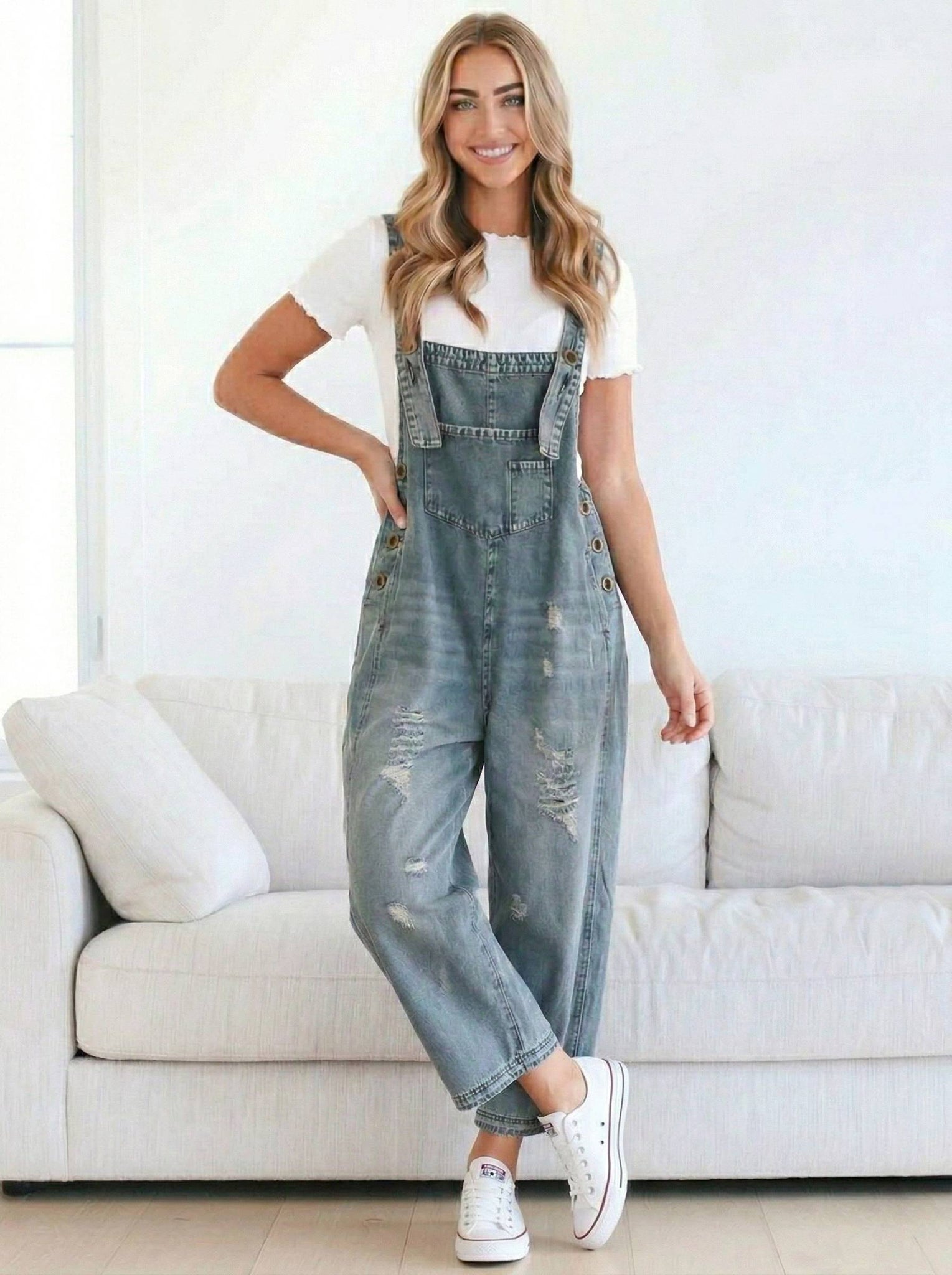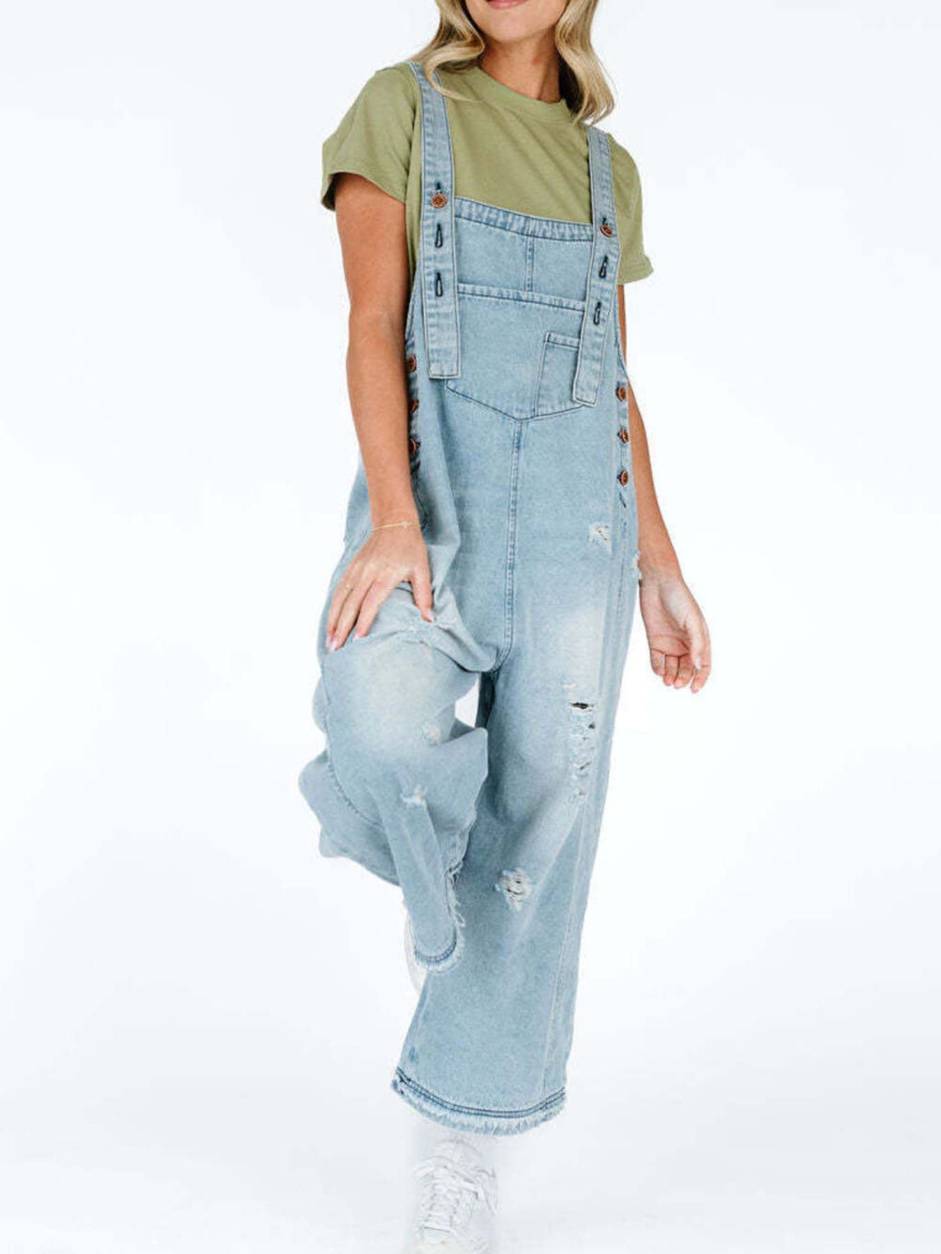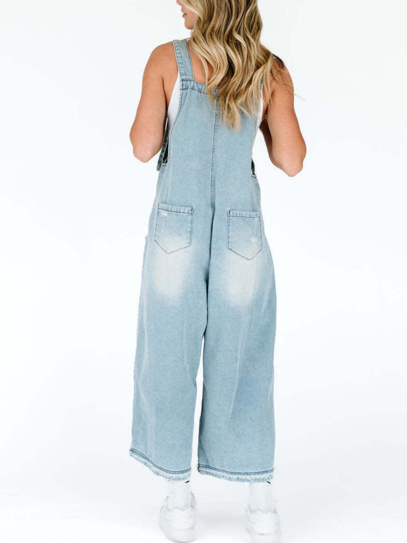 Capture a look that balances statuesque street-style grit with a curated, high-end boutique finish. The Retro Renegade Overalls feature a classic light-wash denim in muted blue tones, offering a "next level" aesthetic that effortlessly upgrades your daily rotation. This contemporary essential is defined by its architectural wide leg silhouette and intentional distressed detailing, providing a polished metropolitan vibe with an unpolished edge. Crafted from a premium blend of 85% cotton and 15% polyester, these overalls deliver a structured, no-stretch profile for an authentic, vintage-inspired handle.