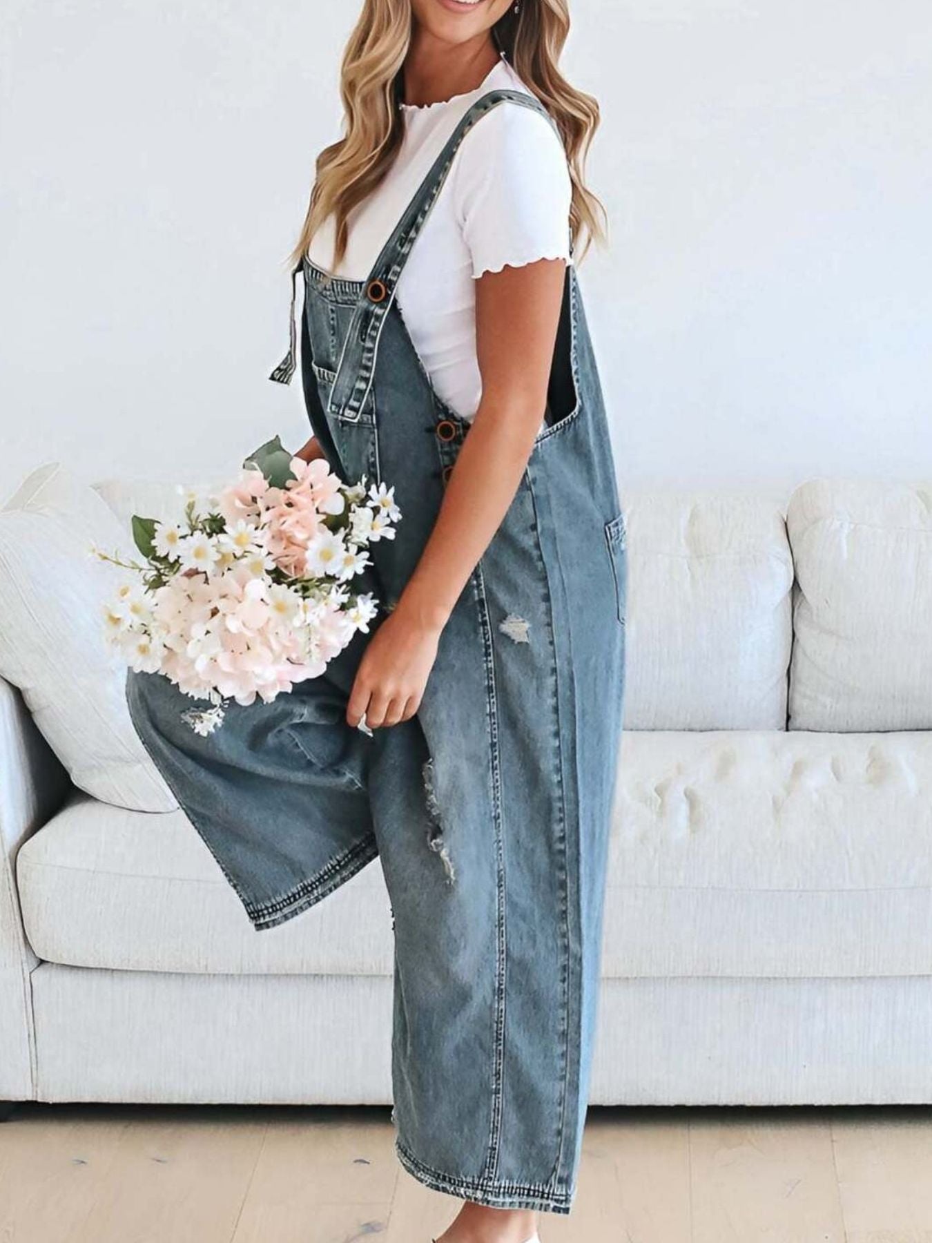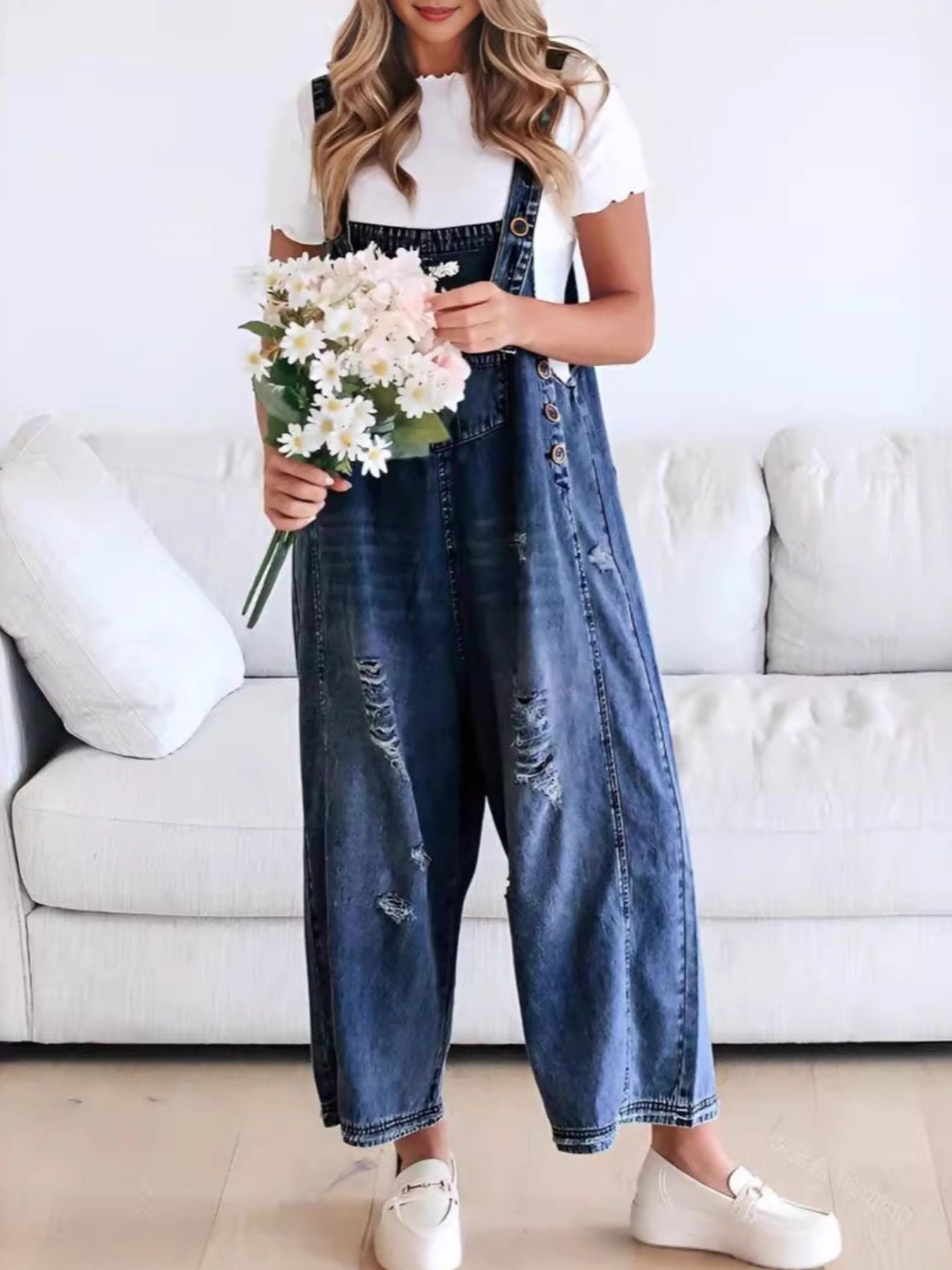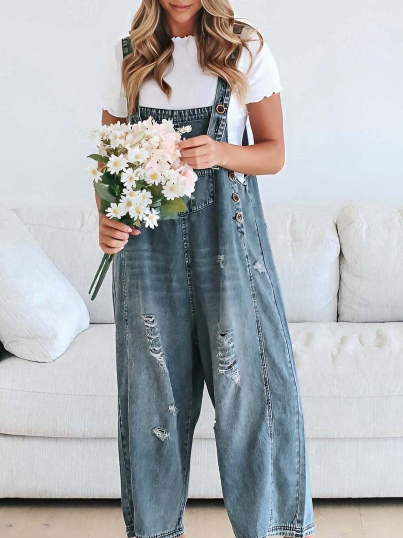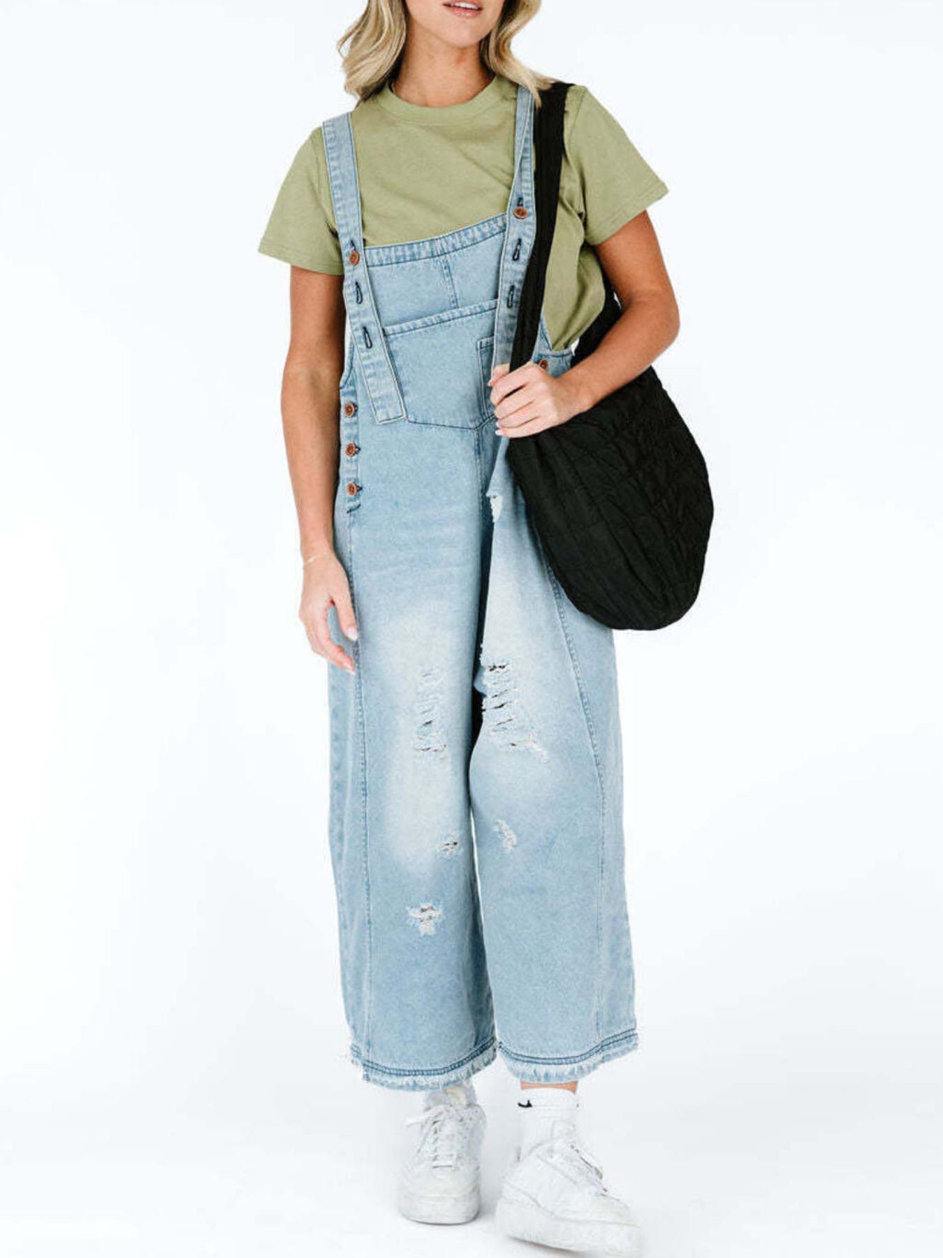 Capture a look that balances statuesque street-style grit with a curated, high-end boutique finish. The Retro Renegade Overalls feature a classic light-wash denim in muted blue tones, offering a "next level" aesthetic that effortlessly upgrades your daily rotation. This contemporary essential is defined by its architectural wide leg silhouette and intentional distressed detailing, providing a polished metropolitan vibe with an unpolished edge. Crafted from a premium blend of 85% cotton and 15% polyester, these overalls deliver a structured, no-stretch profile for an authentic, vintage-inspired handle.
