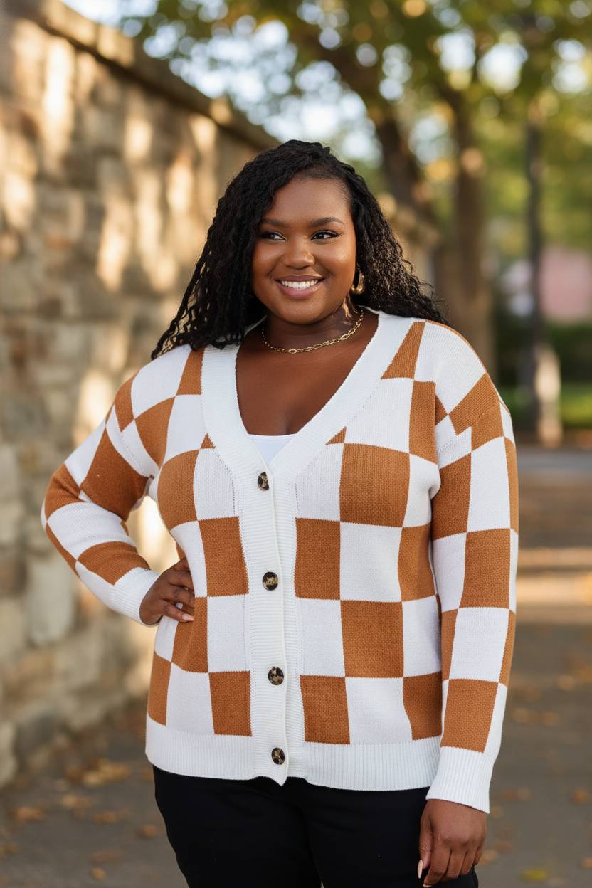 Stay cozy and chic with this checkered button-up V-neck dropped shoulder cardigan. The checkered pattern adds a trendy and eye-catching element to this classic cardigan, while the button-up design allows for versatile styling options. The dropped shoulder design adds a relaxed and comfortable fit, perfect for layering or wearing on its own. Stay stylish and warm with this must-have checkered cardigan.