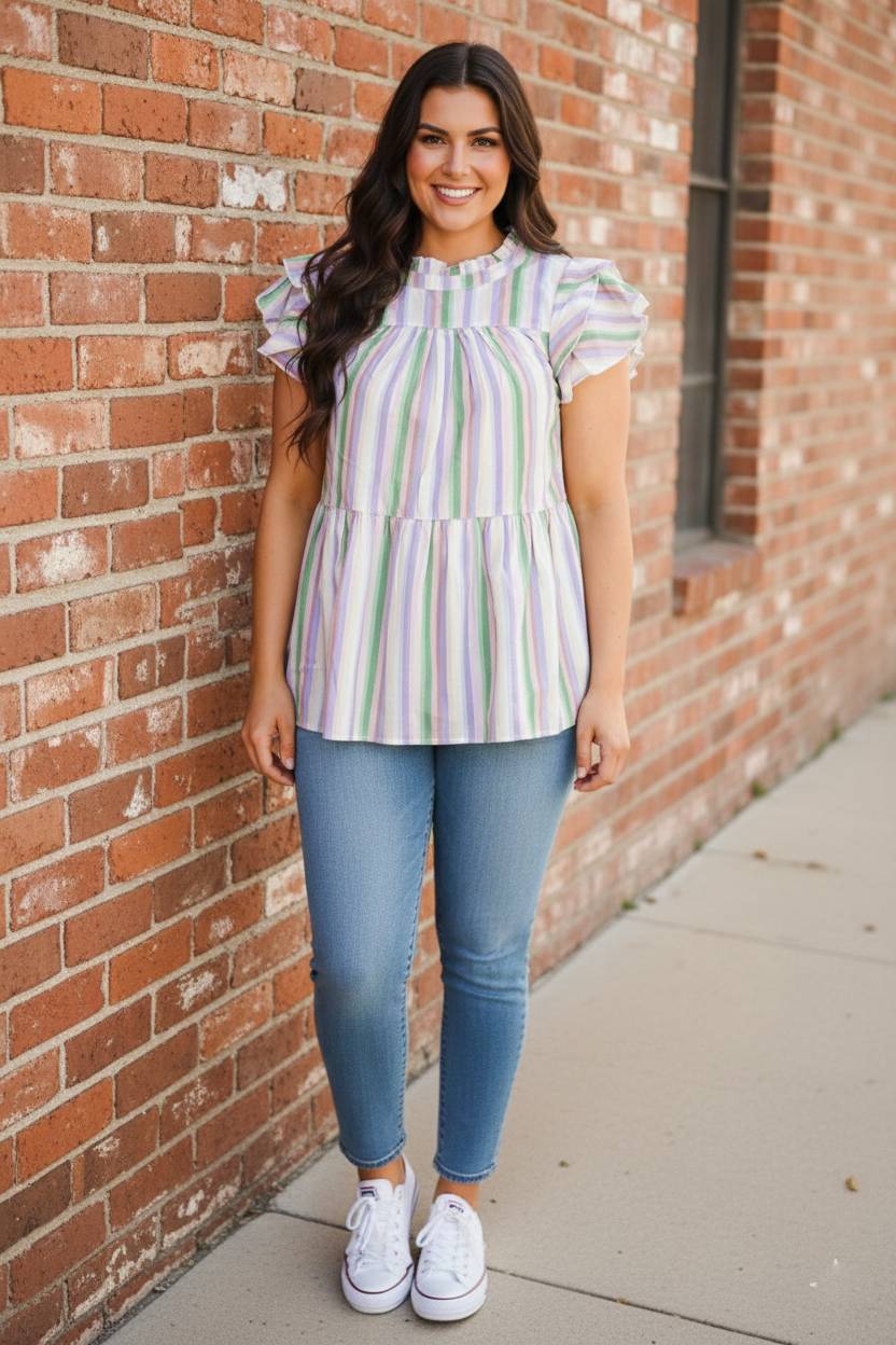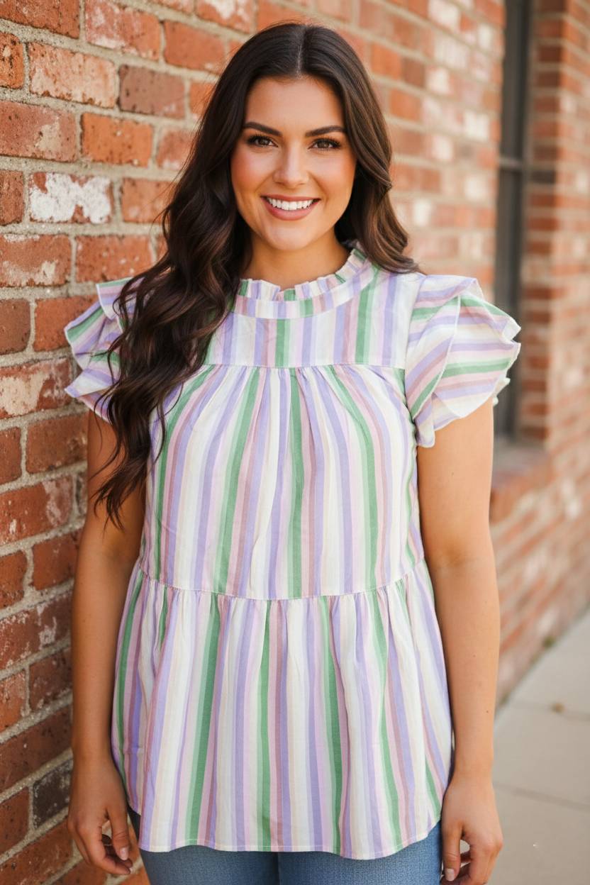 Get ready for date night in this lavender and sage romantic double ruffle short sleeve top with a tiered design and round neck. A back clasp keyhole completes this charming style.