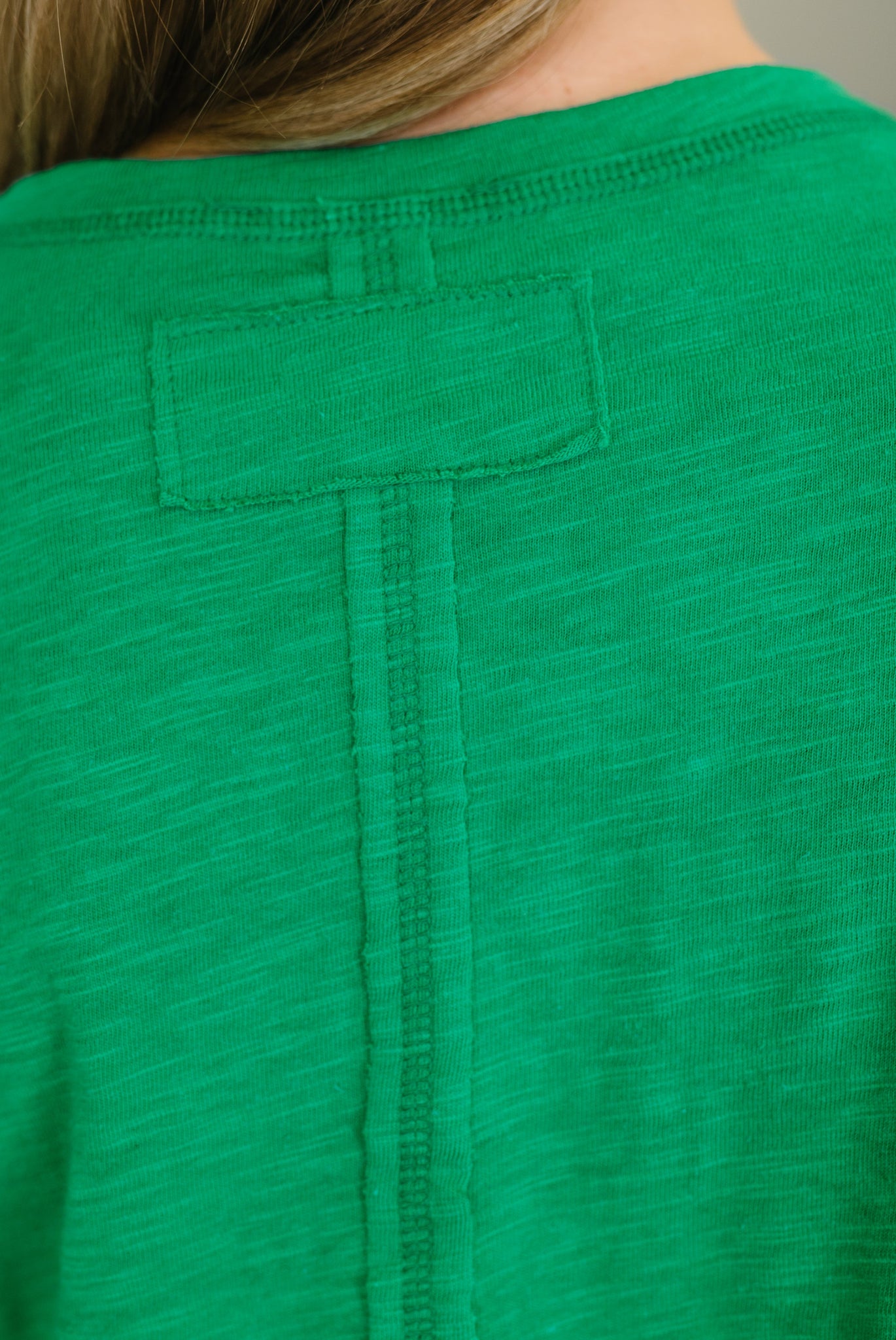 The Effortless Edit Boxy Tee in Kelly Green features a relaxed, contemporary silhouette crafted from soft jersey knit with gentle stretch for all-day comfort. The heathered fabric adds subtle texture and depth, while the banded round neckline and drop shoulder design create an effortlessly chic look. Side slits and an exposed center seam at the back provide modern edge, complemented by exposed seam details throughout and a faux back outside tag for authentic styling.