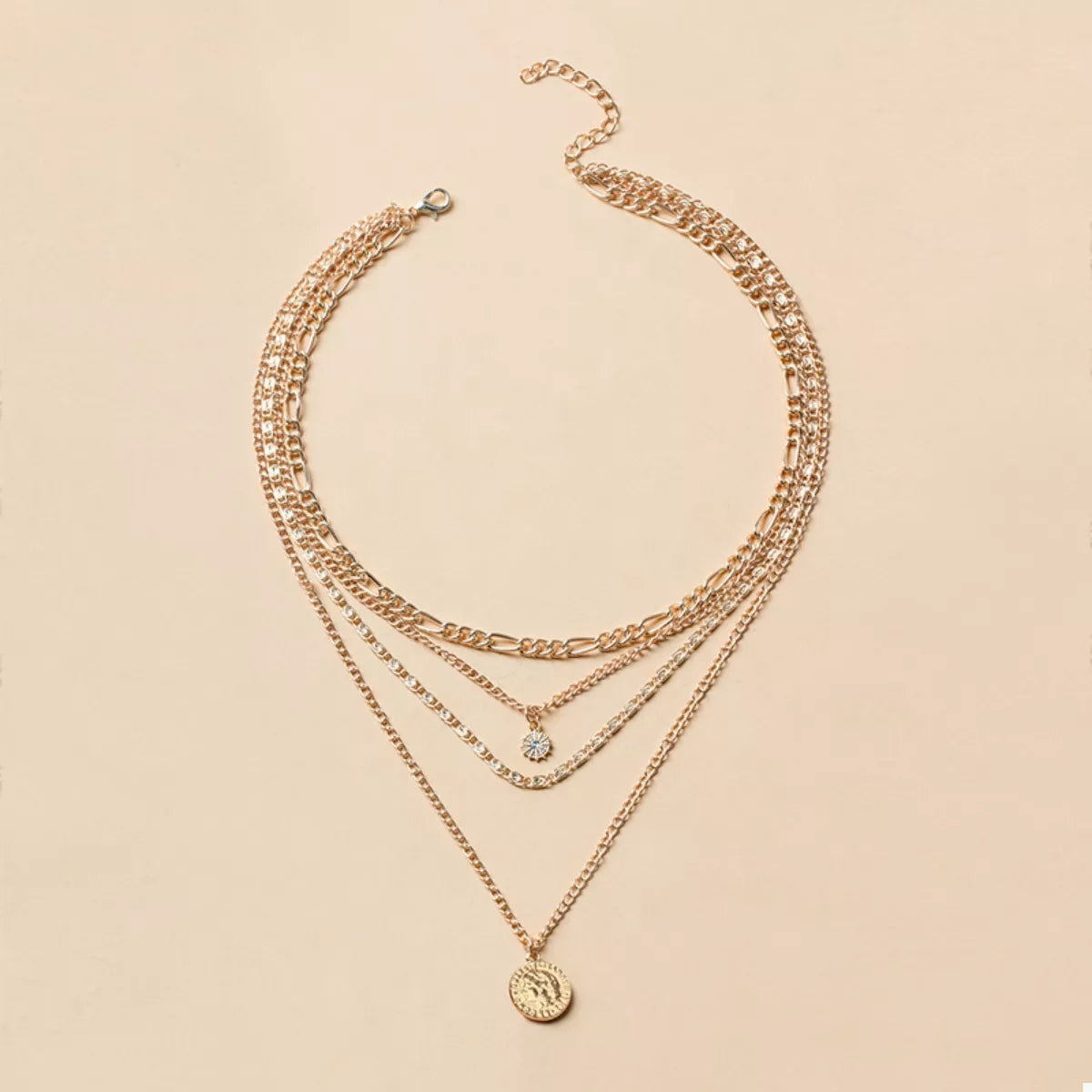 This gorgeous, four-strand necklace features a mix of delicate chains—from classic curb links to thinner box chains—finished with two charming pendants: a tiny, sparkling rhinestone charm and a detailed coin medallion. Designed to sit perfectly at different lengths, it adds texture and shine to any neckline.