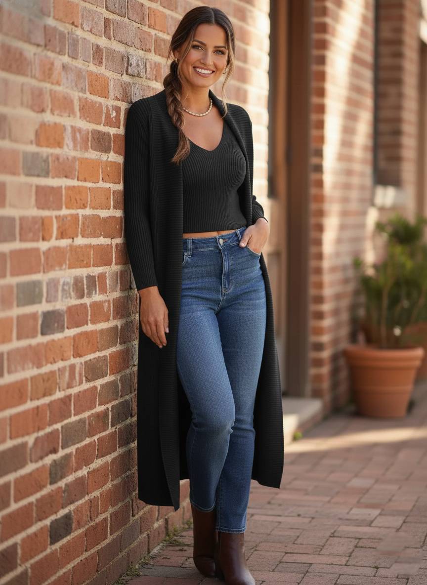 Step into a world of effortless coordination and timeless style with a duo designed for the woman who loves a polished, layered look. The Charming Life Set features a sleek, form-fitting ribbed knit tank paired with a matching open-front longline cardigan. This versatile two-piece ensemble is crafted from a cozy, high-quality blend that offers a soft, sweater-like texture with slightly stretchy properties for all-day comfort. With functional side pockets on the cardigan and a clean, minimalist silhouette, this set transitions beautifully from a productive morning in the office to a relaxed evening out.