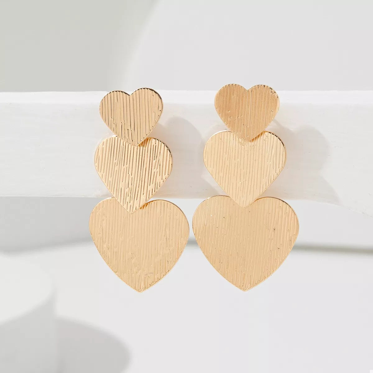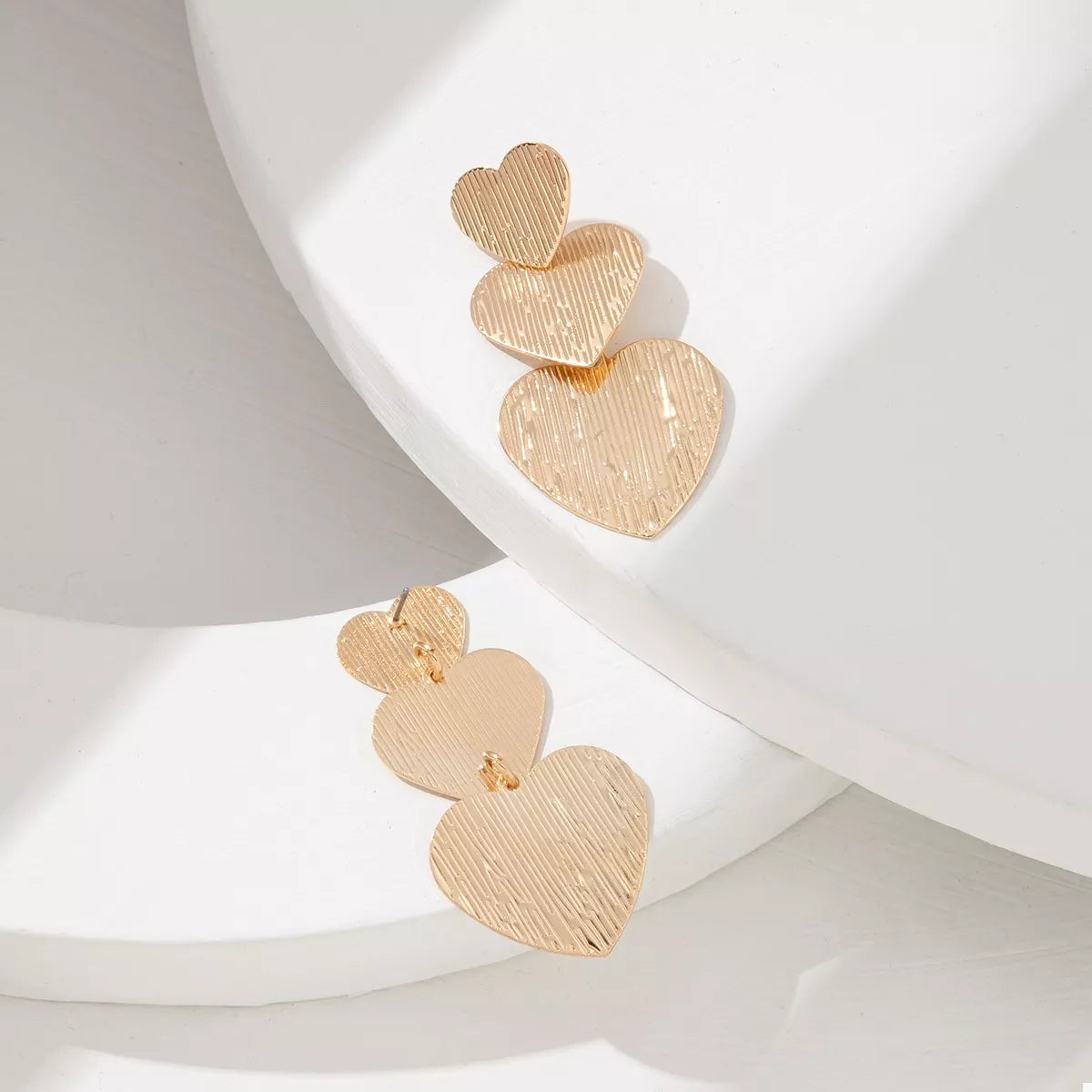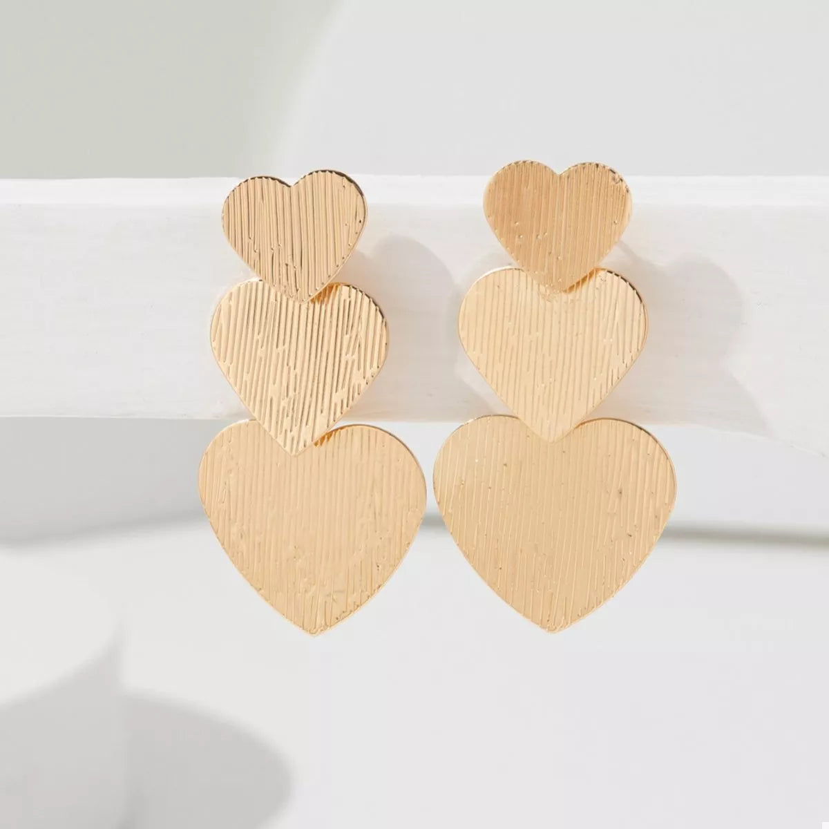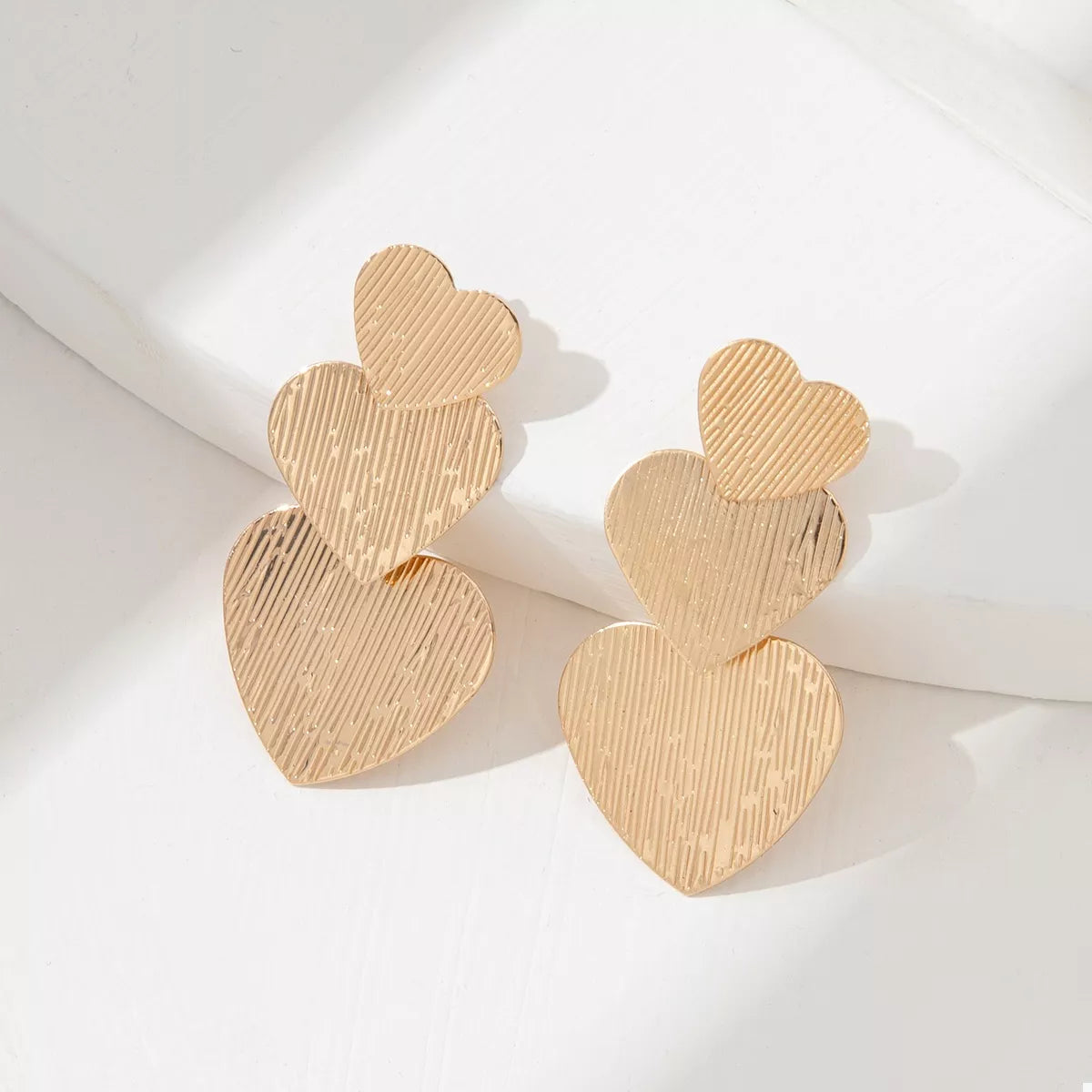 Make a golden statement with Triple Heartbeat Statement Earrings! These earrings feature three graduating textured heart charms that cascade elegantly, creating beautiful movement and shine. The brushed, subtle line texture on the surface ensures they catch the light without being overtly flashy. Finished with brilliant 18K Gold Plating, these drops are perfect for adding modern romance and high-impact glamour to any look. Lightweight and chic, they're ready for your next event or date night.