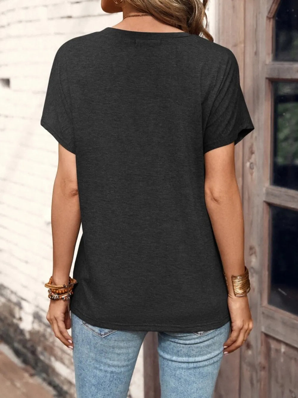 Simple, effortless, and stylish—the Everyday Essential Button Tee is your new favorite for all things casual. Featuring a flattering notched neckline with half-button detail and a relaxed silhouette, this top is the definition of easy-chic.