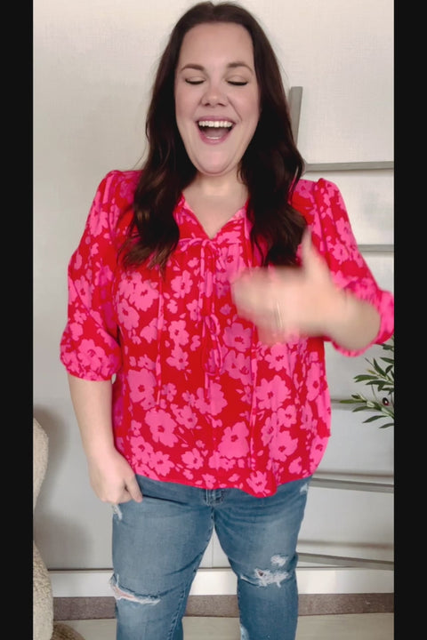 New Day Red Ribbon Bow Detail Floral Woven Blouse