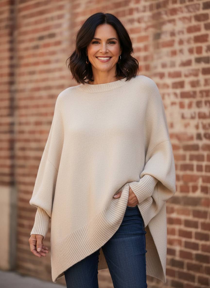 Wrap yourself in the effortless luxury of the Morning in Manhattan Sweater, a piece designed for those who appreciate the intersection of cozy comfort and high-street style. This knit makes a bold statement with its dramatic oversized silhouette and sweeping batwing sleeves, creating a modern, architectural drape that feels both relaxed and incredibly chic. The classic round neck is balanced by a wide, ribbed hem and extended cuffs, adding a touch of structured texture to the fluid design. Crafted with a slightly stretchy handle, this sweater is the ultimate layering essential for crisp mornings and sophisticated city strolls.
