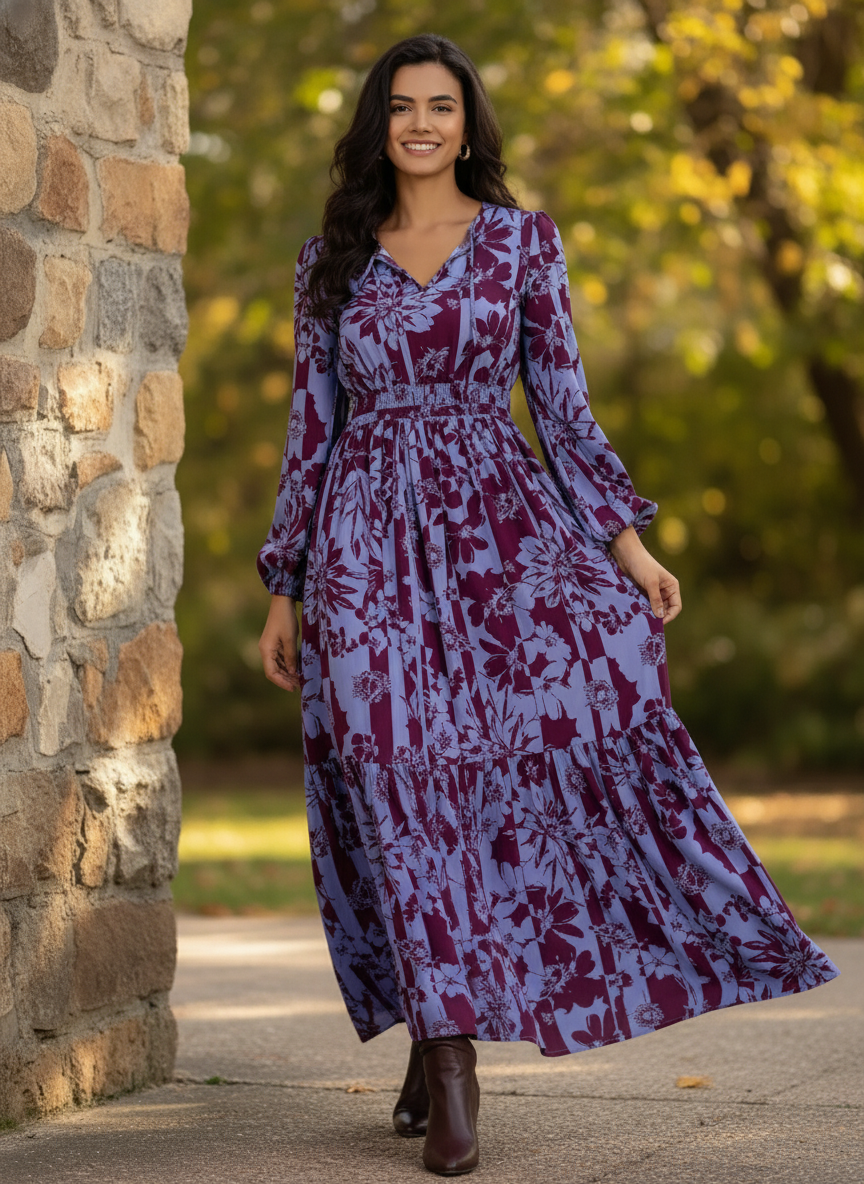 Float into any occasion with Twilight Meadow Smocked Maxi Dress! This stunning dress features a vibrant two-tone floral print in gorgeous shades of purple and berry. It offers elegant details like romantic balloon sleeves and a stylish tie neckline that you can wear open or cinched. The highly flattering smocked waist provides comfortable definition before flowing into a chic tiered maxi skirt. Crafted from lightweight 100% polyester, this dress is perfect for transitional weather and pairs beautifully with boots or heels.