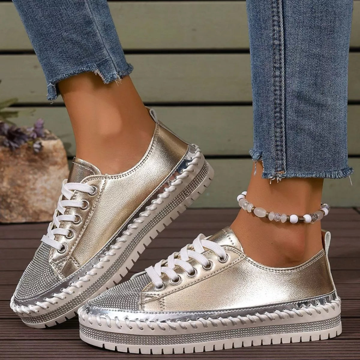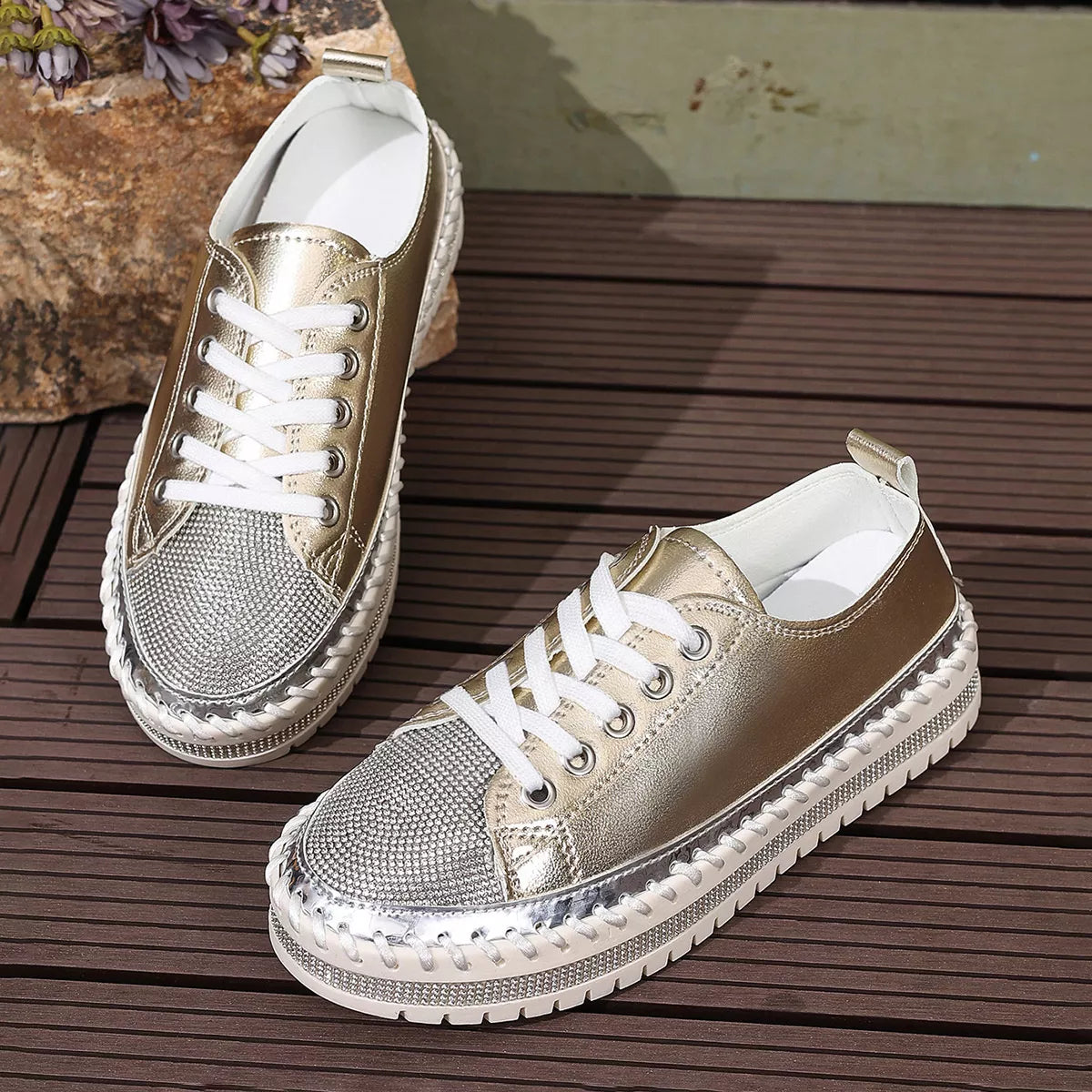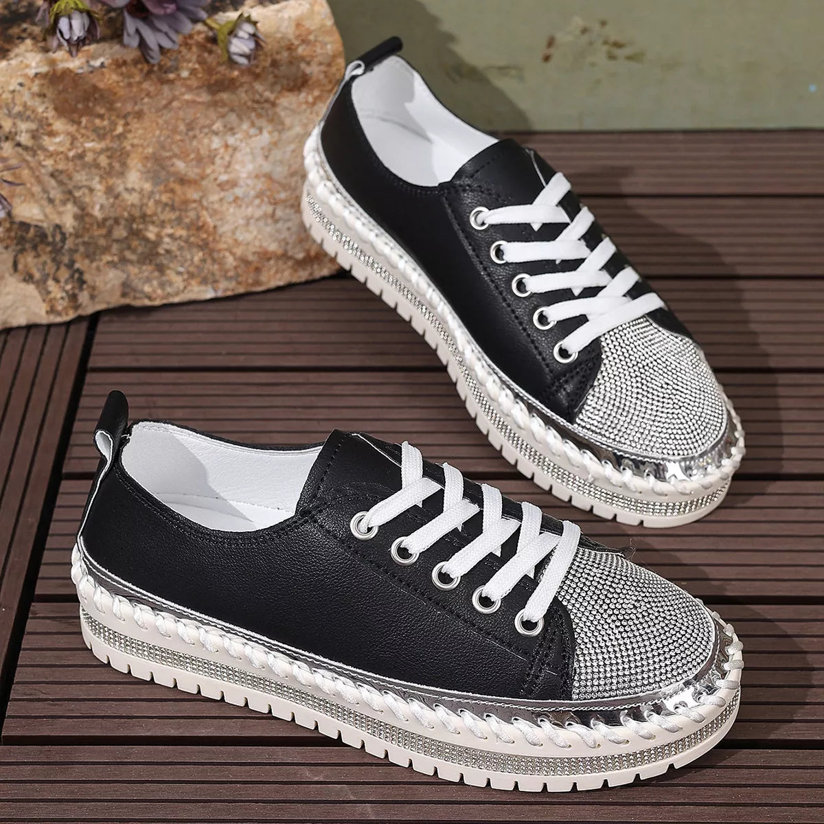 Step into the spotlight with a pair that balances high-shine glamour and everyday urban energy. The Stardust Strut Sneakers are defined by their eye-catching rhinestone toe box and metallic whipstitch detailing, offering a curated boutique aesthetic for those who love to sparkle. Designed with a trendy round toe and a supportive platform sole, these shoes provide a statuesque lift while maintaining the easy comfort of a flat heel profile. Crafted from premium PU Vegan Leather and a durable rubber outsole, they deliver a structured, long-lasting finish that turns any sidewalk into a runway.