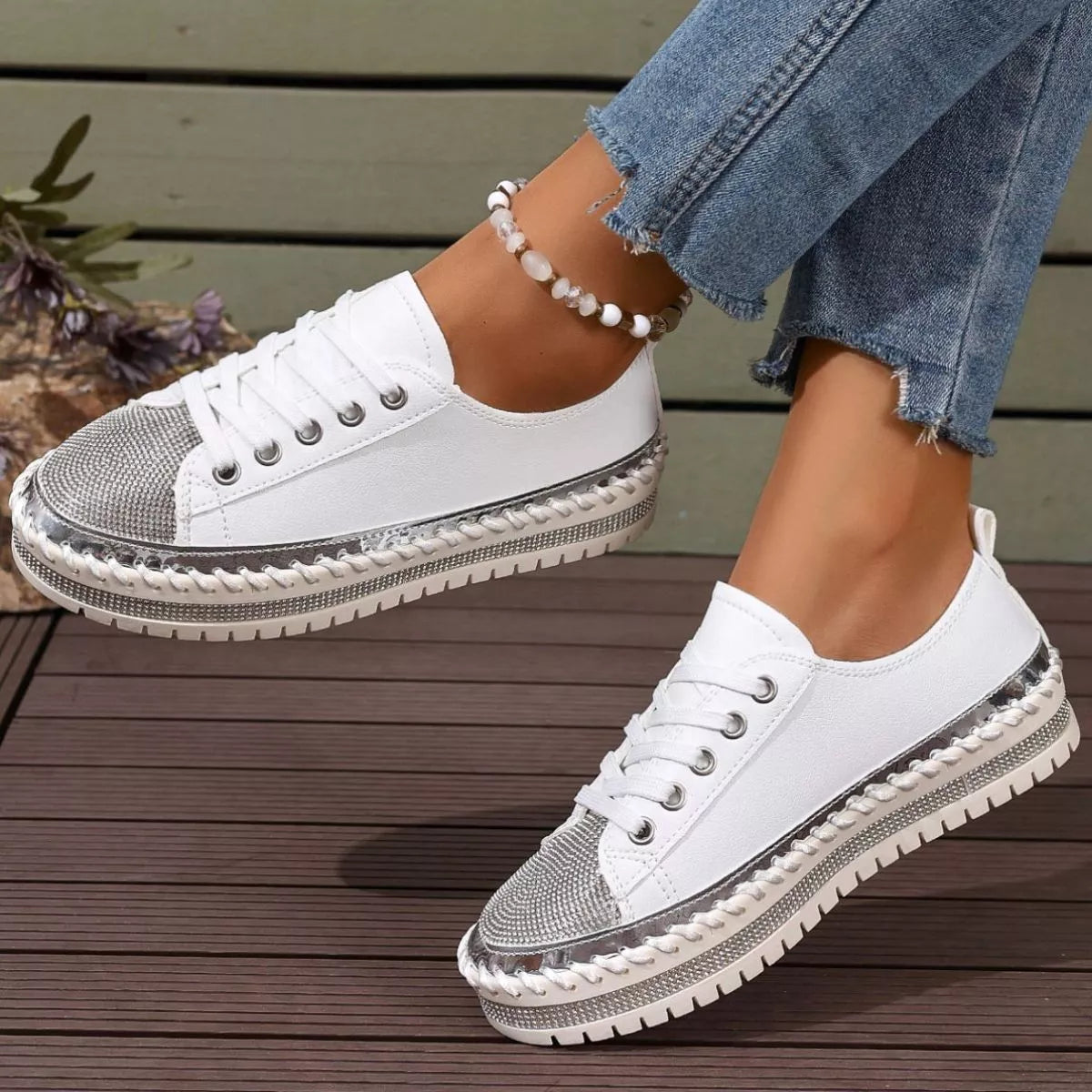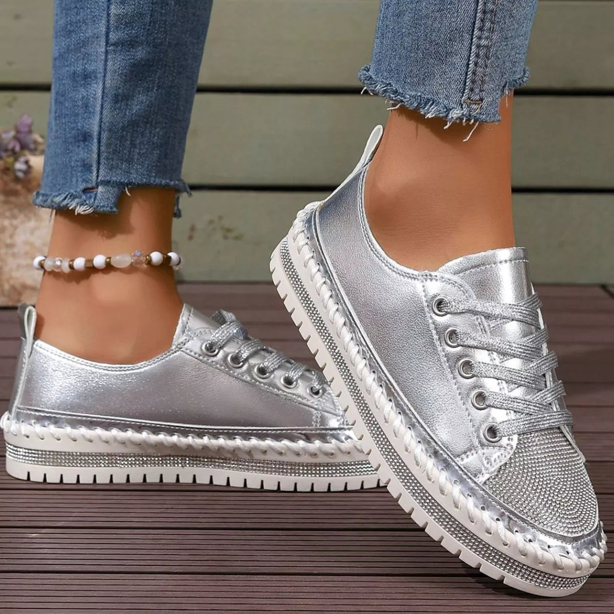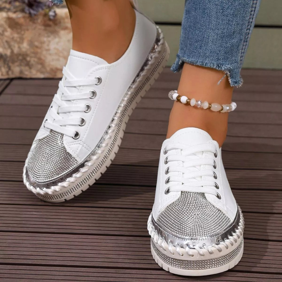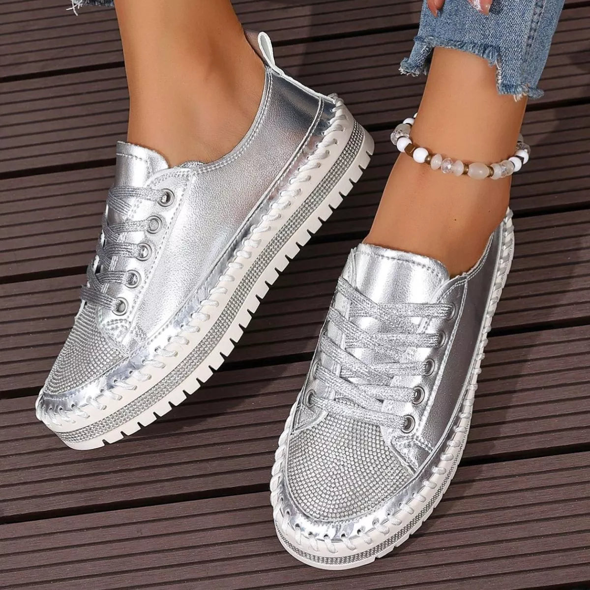 Step into the spotlight with a pair that balances high-shine glamour and everyday urban energy. The Stardust Strut Sneakers are defined by their eye-catching rhinestone toe box and metallic whipstitch detailing, offering a curated boutique aesthetic for those who love to sparkle. Designed with a trendy round toe and a supportive platform sole, these shoes provide a statuesque lift while maintaining the easy comfort of a flat heel profile. Crafted from premium PU Vegan Leather and a durable rubber outsole, they deliver a structured, long-lasting finish that turns any sidewalk into a runway.