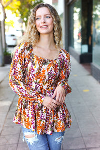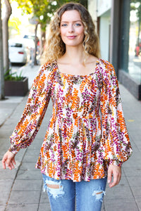 Slip on this flirty taupe and rust floral print babydoll top over jeans or shorts for an adorable look this fall. Keep it sweet with long bubble sleeves, and a square neck.