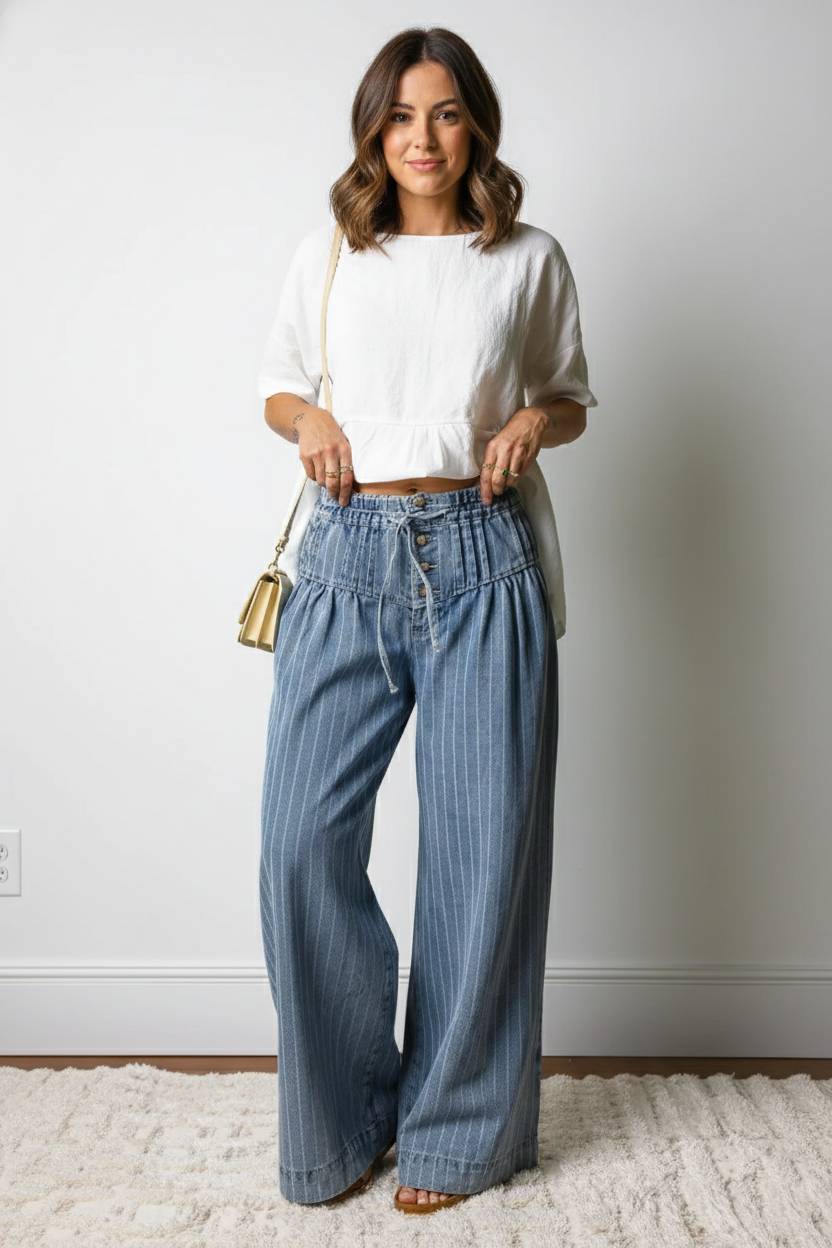 Capture the essence of effortless style with a pair that redefines casual denim. The Weekend Classic Jeans feature a timeless vertical stripe pattern that creates an elongated, flattering silhouette, perfect for any relaxed outing. This unique design boasts a comfortable drawstring waist with elegant pleated detailing, offering a relaxed fit that doesn't compromise on sophistication. Finished with a classic buttoned front and a dramatic wide-leg cut, these jeans provide a breezy, fluid motion that pairs beautifully with simple tees or tucked-in blouses.