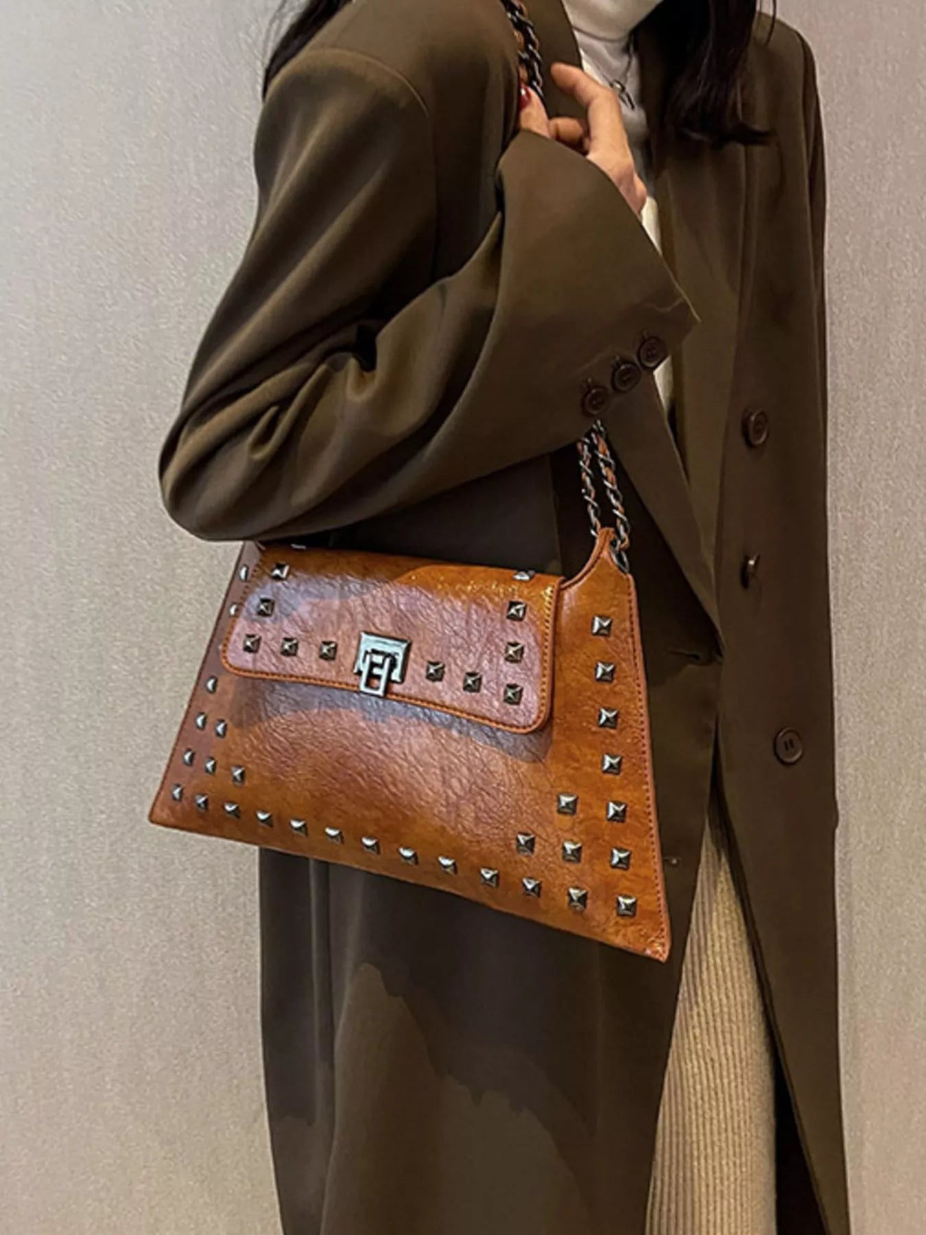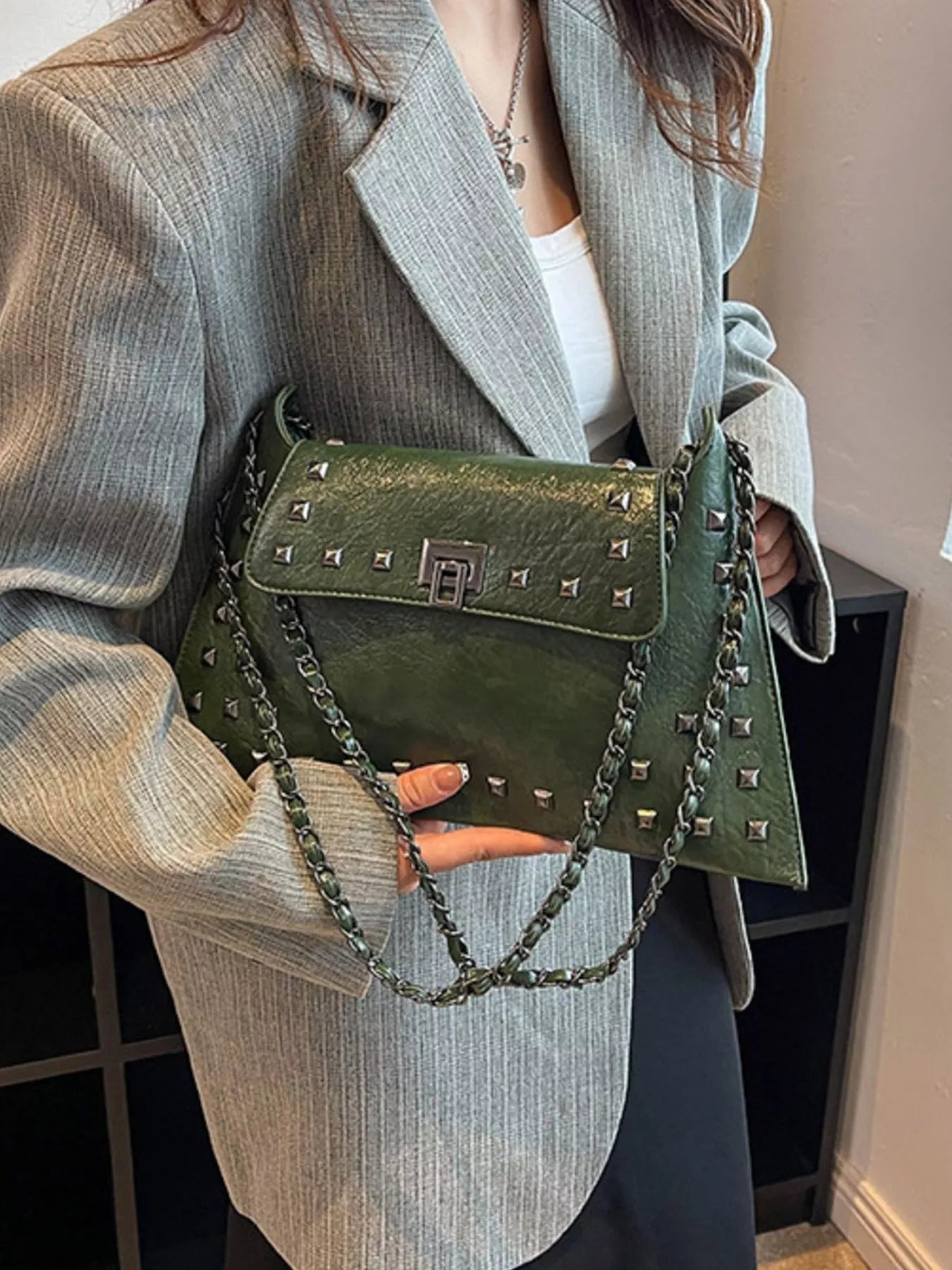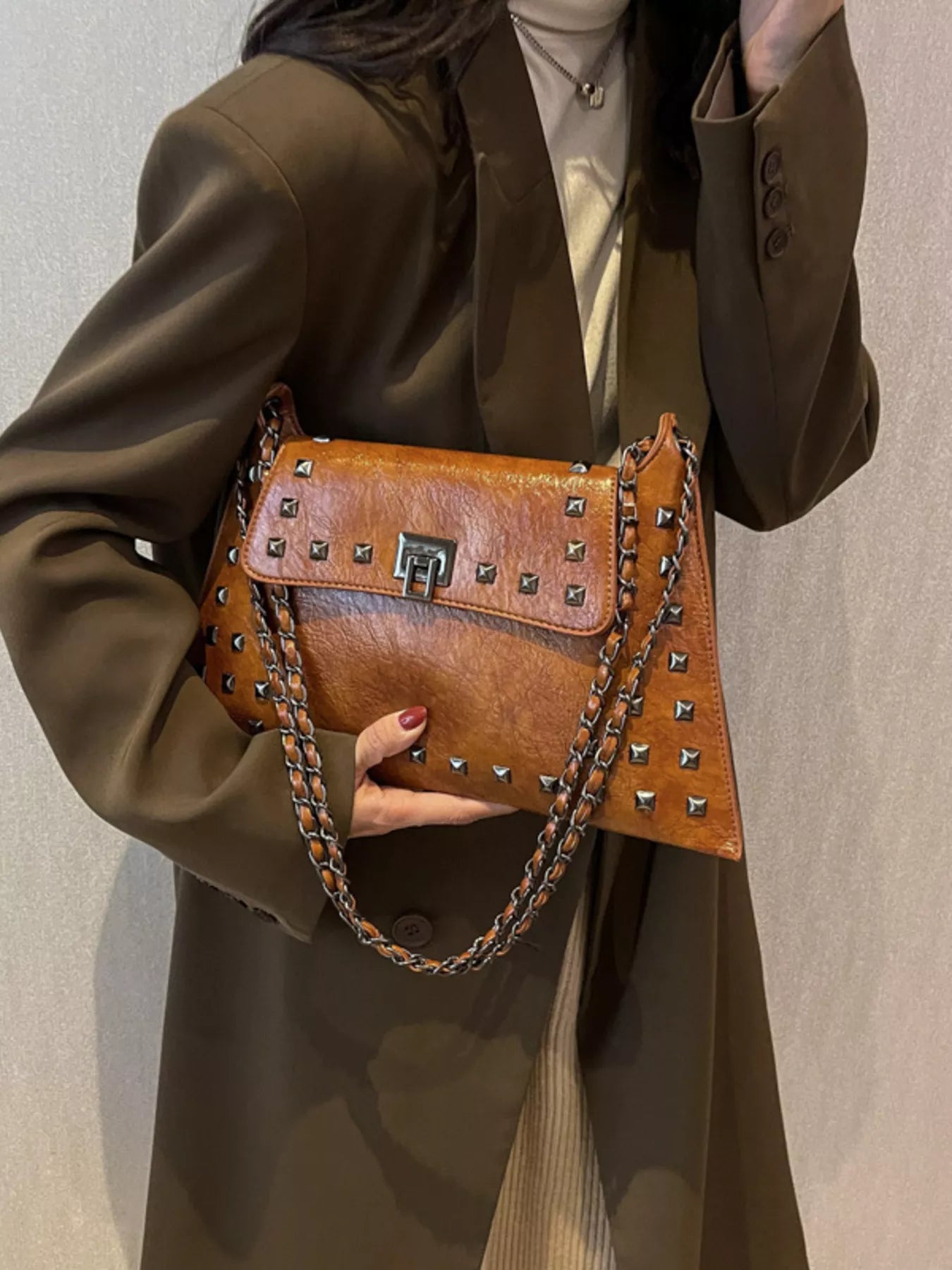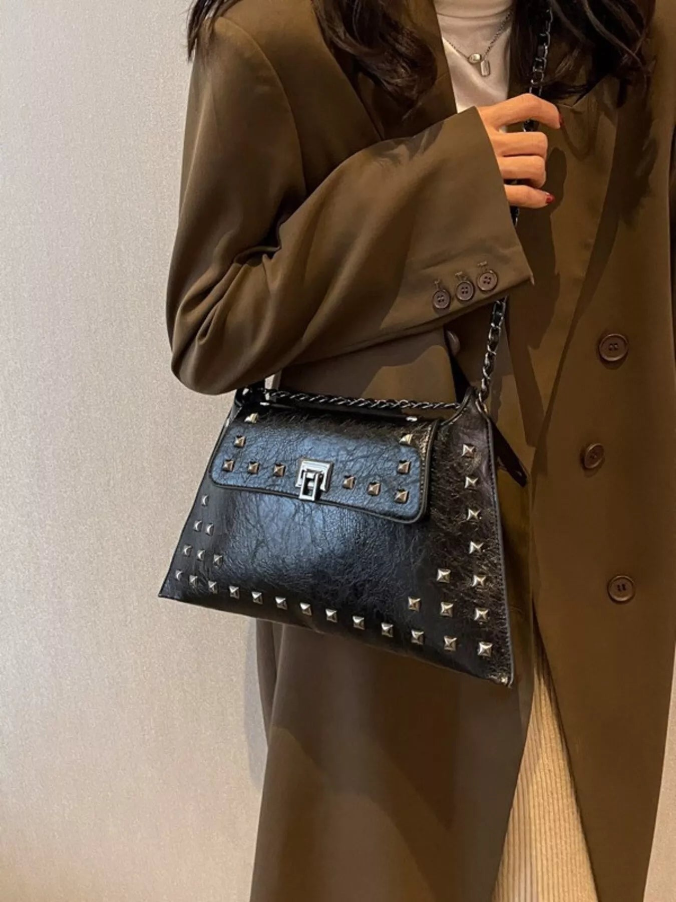 Add an instant dose of "cool-girl" energy to your look with the bag that balances edgy hardware and timeless boutique sophistication! The Midnight Edge Shoulder Bag is a masterclass in textural design, featuring a buttery-soft, "crinkled" vegan leather finish that gives it a high-end, vintage-rock vibe. We are head-over-heels for the bold pyramid stud detailing and the industrial-chic chain strap that catches the light from every angle. Perfectly sized for all your essentials—and maybe a few non-essentials too—this medium flap bag transitions seamlessly from a sharp blazer-and-denim day look to a sleek date night aesthetic. Whether you're opting for the classic noir or a bold alternative, this is the statement piece your accessory collection has been craving.