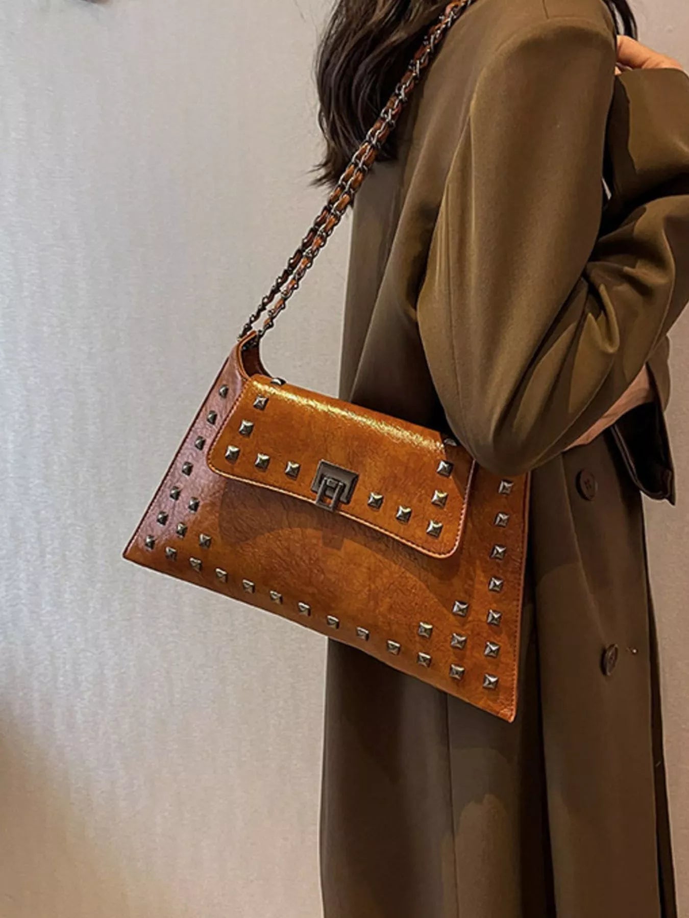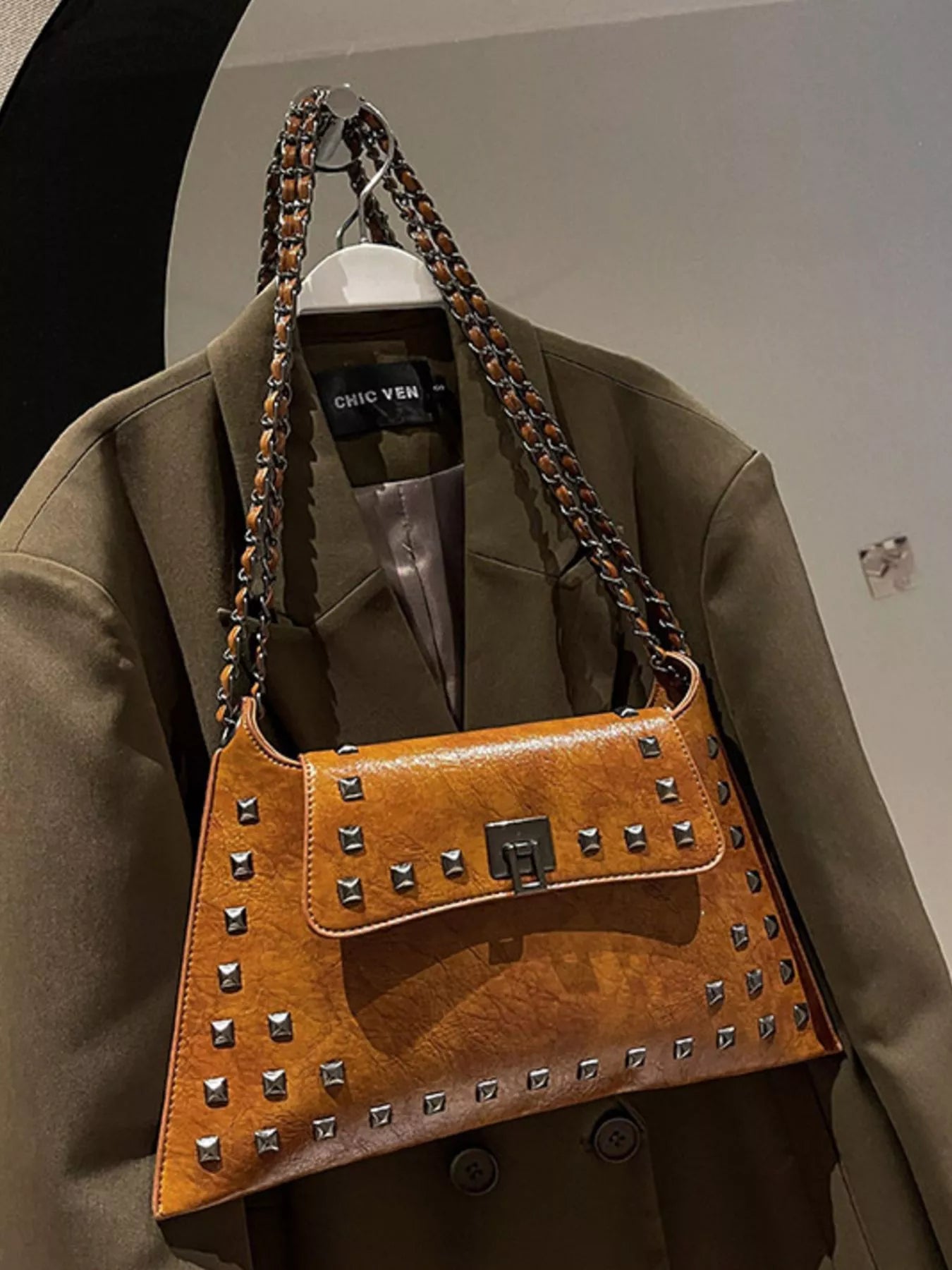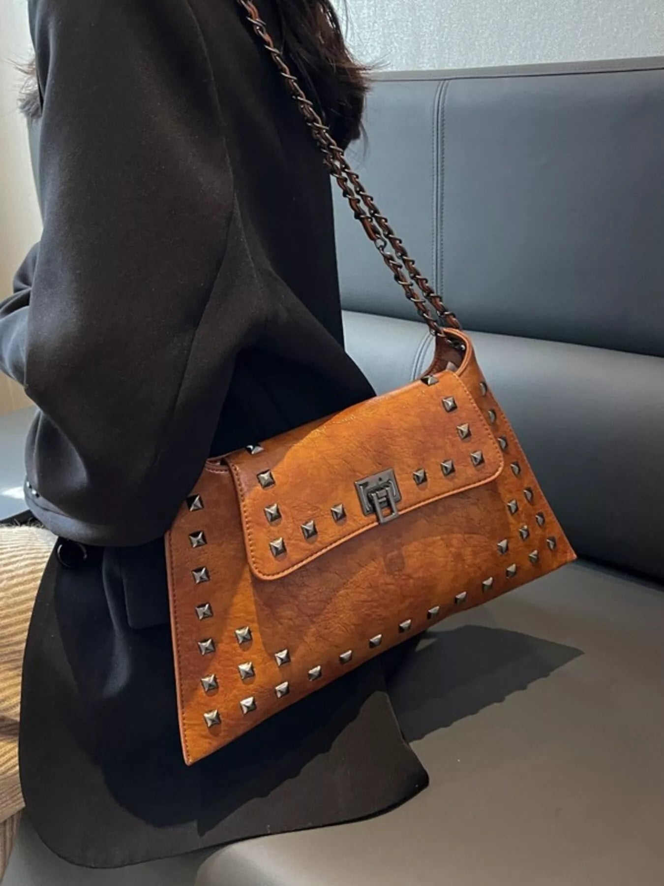 Add an instant dose of "cool-girl" energy to your look with the bag that balances edgy hardware and timeless boutique sophistication! The Midnight Edge Shoulder Bag is a masterclass in textural design, featuring a buttery-soft, "crinkled" vegan leather finish that gives it a high-end, vintage-rock vibe. We are head-over-heels for the bold pyramid stud detailing and the industrial-chic chain strap that catches the light from every angle. Perfectly sized for all your essentials—and maybe a few non-essentials too—this medium flap bag transitions seamlessly from a sharp blazer-and-denim day look to a sleek date night aesthetic. Whether you're opting for the classic noir or a bold alternative, this is the statement piece your accessory collection has been craving.