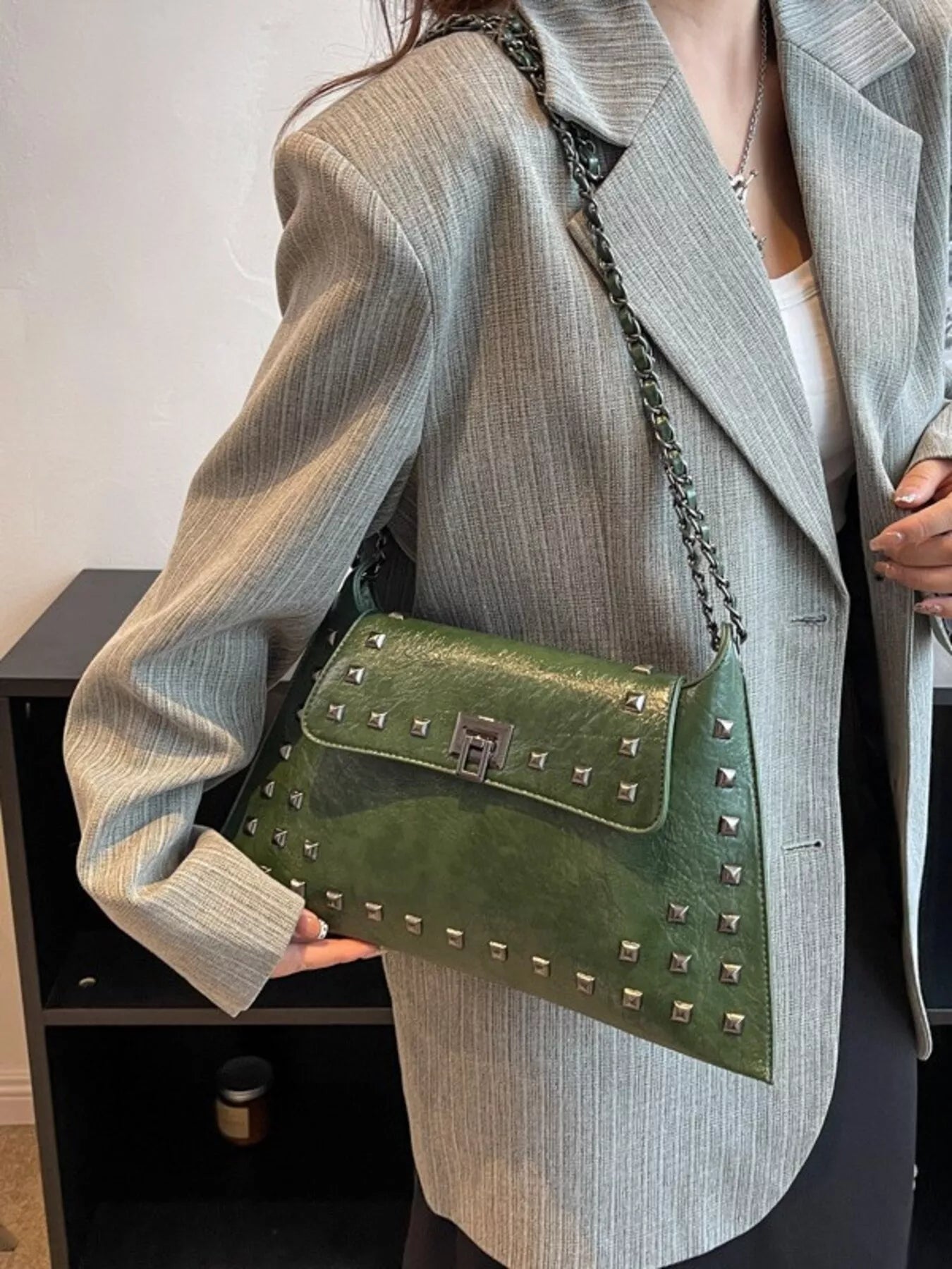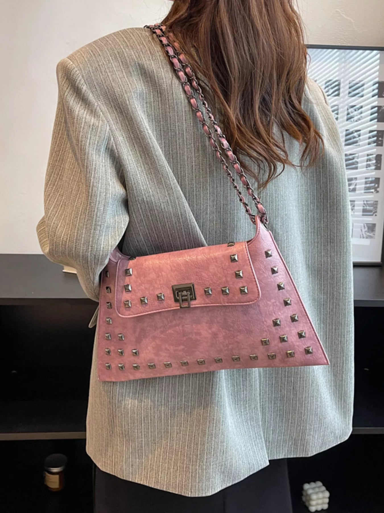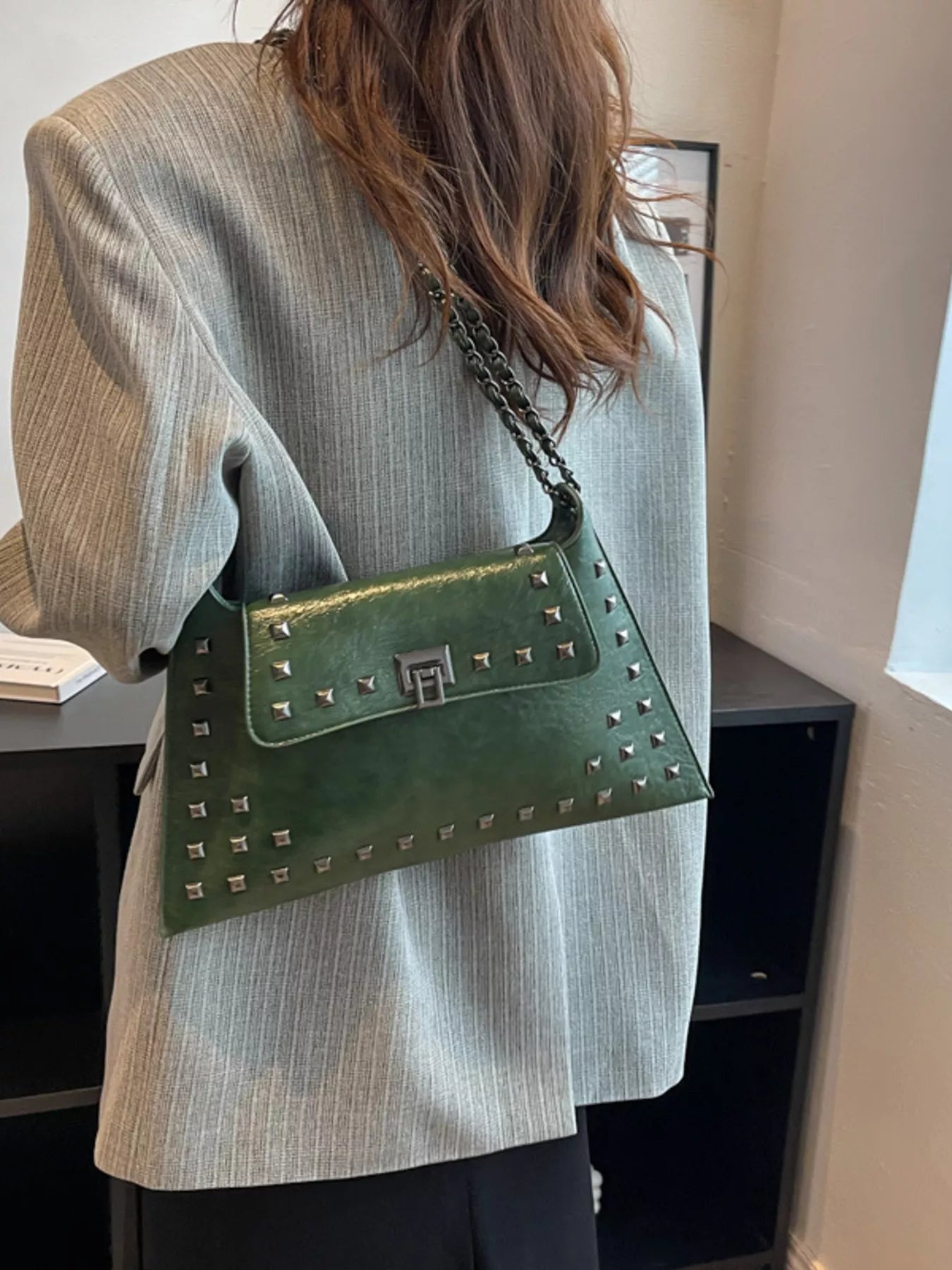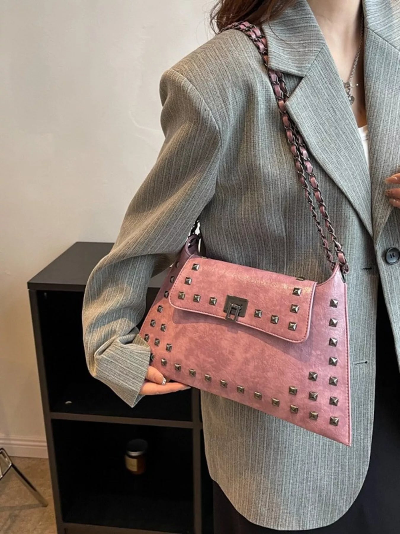 Add an instant dose of "cool-girl" energy to your look with the bag that balances edgy hardware and timeless boutique sophistication! The Midnight Edge Shoulder Bag is a masterclass in textural design, featuring a buttery-soft, "crinkled" vegan leather finish that gives it a high-end, vintage-rock vibe. We are head-over-heels for the bold pyramid stud detailing and the industrial-chic chain strap that catches the light from every angle. Perfectly sized for all your essentials—and maybe a few non-essentials too—this medium flap bag transitions seamlessly from a sharp blazer-and-denim day look to a sleek date night aesthetic. Whether you're opting for the classic noir or a bold alternative, this is the statement piece your accessory collection has been craving.