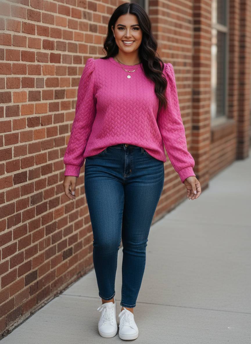 Elevate your everyday essentials with a piece that balances cozy comfort and sophisticated, sculptural detail. The Enchanted Ivy Top is defined by its intricate, all-over chevron-inspired textured knit that adds an artisanal, high-end feel to a classic silhouette. This statuesque design features dramatic ruched puff sleeves that create a curated, feminine frame, making it a versatile staple for both relaxed afternoons and polished evening outings. Crafted from durable 100% polyester, this top offers a soft-touch handle with slight stretch for a flattering fit that maintains its unique texture through every wear.