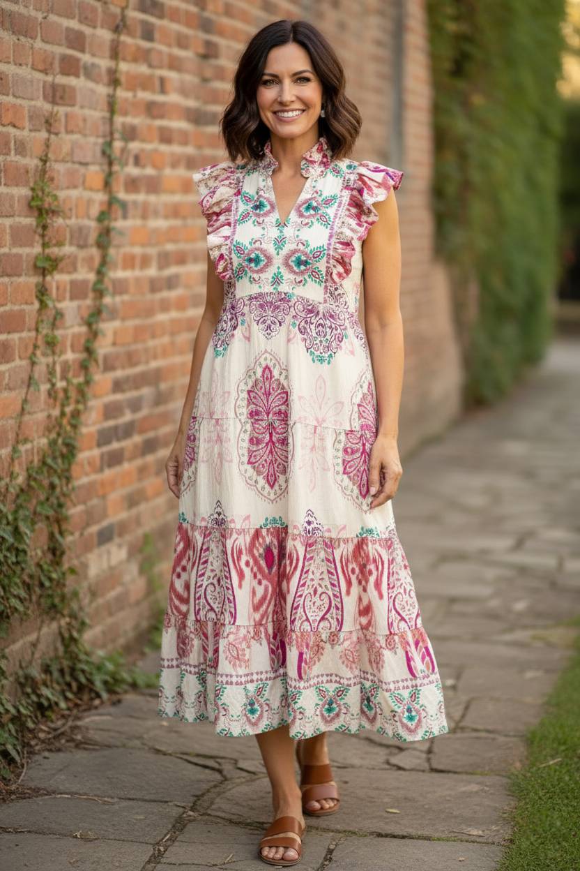 Discover a look of ethereal, statuesque charm with a piece designed for high-end boutique elegance and airy, all-day ease. The Bohemian Rhapsody Midi by Umgee features an intricate, multi-colored border print in muted shades of plum, teal, and magenta, offering a curated aesthetic that effortlessly upgrades your summer rotation. This contemporary essential is defined by its architectural ruffle flutter shoulders and a tiered silhouette, providing a "next level" look that balances free-spirited whimsy with a polished frame. Crafted from a premium blend of 85% rayon and 15% nylon, this dress delivers a lightweight, breathable handle with a structured no-stretch profile.