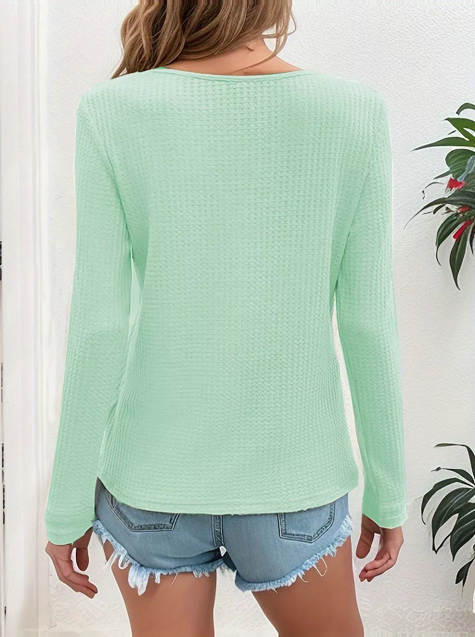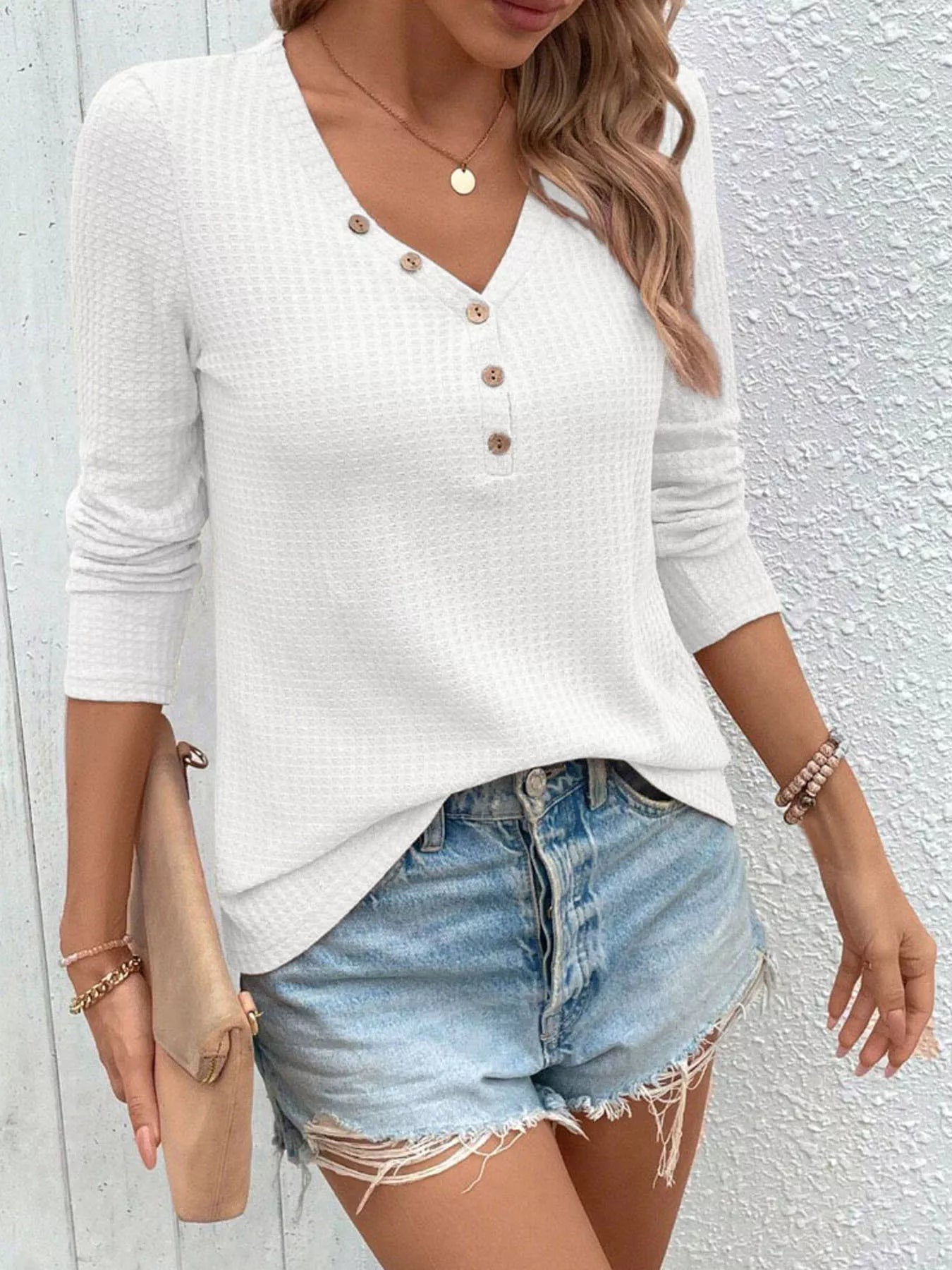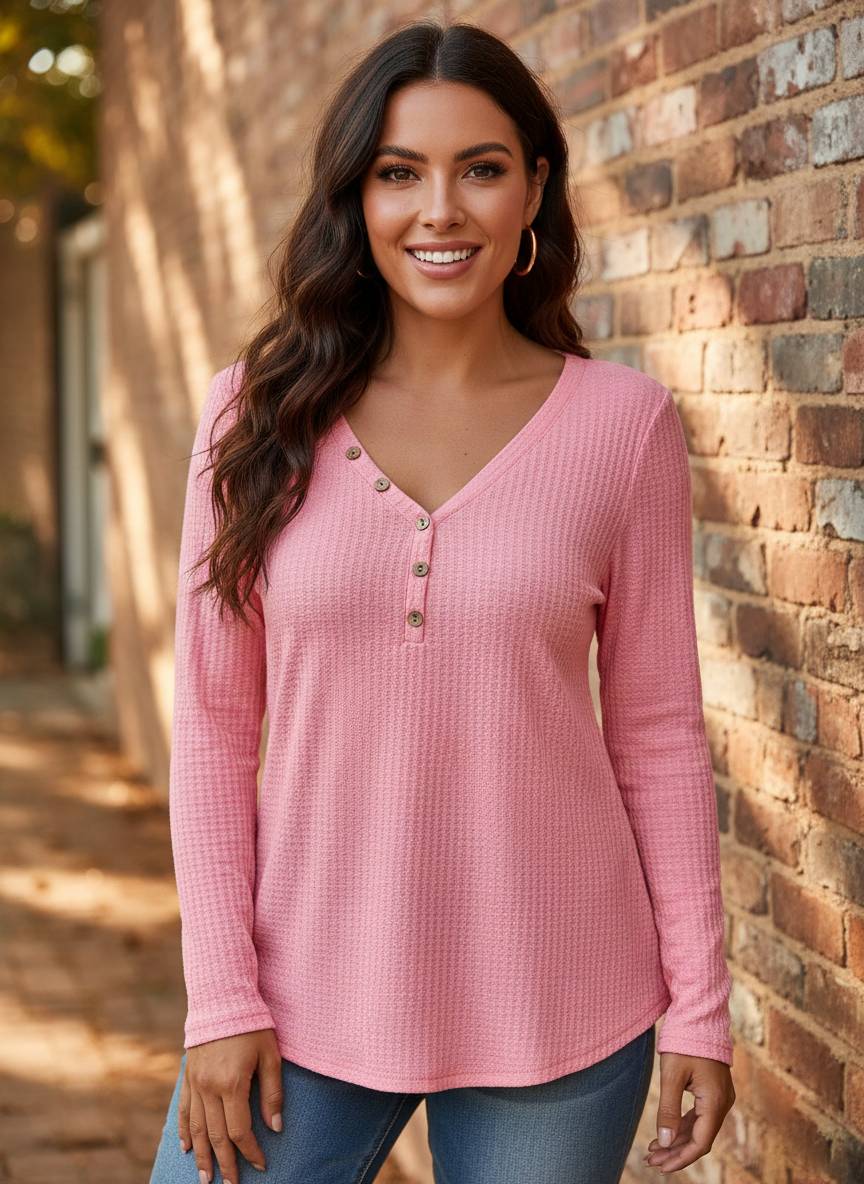 Elevate your casual rotation with a piece that perfectly captures the essence of slow weekend mornings. The Bistro Cozy Top is crafted from a premium waffle knit fabric, providing a rich, honeycomb texture that is both breathable and exceptionally soft to the touch. The flattering V-neckline is accented with a delicate button-detail placket, lending a touch of vintage-inspired charm to the modern silhouette. Designed with long sleeves and a gentle, body-skimming drape, this versatile top transitions seamlessly from a quiet coffee date to a scenic autumn stroll.