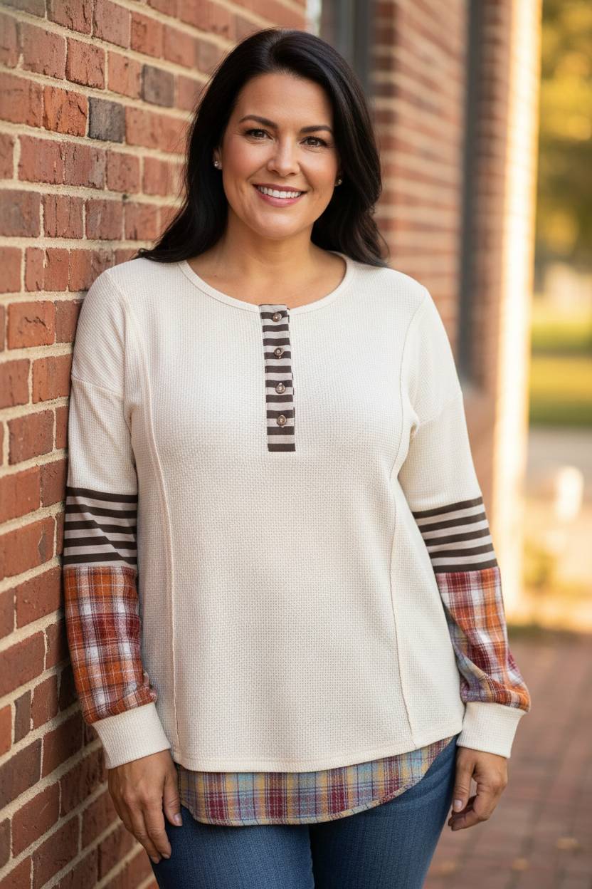 The body is made from a soft waffle knit that provides lovely texture and comfort. The top is beautifully accented with a vertical button placket and is finished with a fun mix of patterns: plaid and stripes on the sleeves and hemline, creating a chic layered look. Made with a slightly stretchy cotton blend, this is the perfect effortless piece for crisp weather outings or relaxing by the fire.